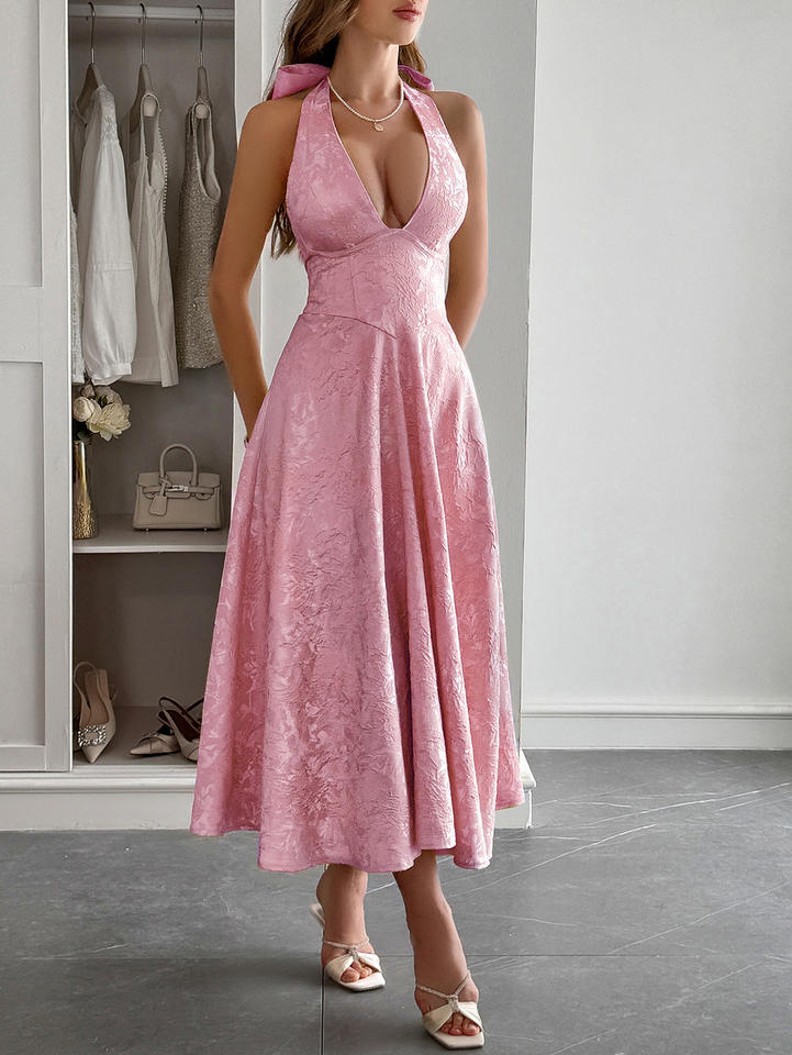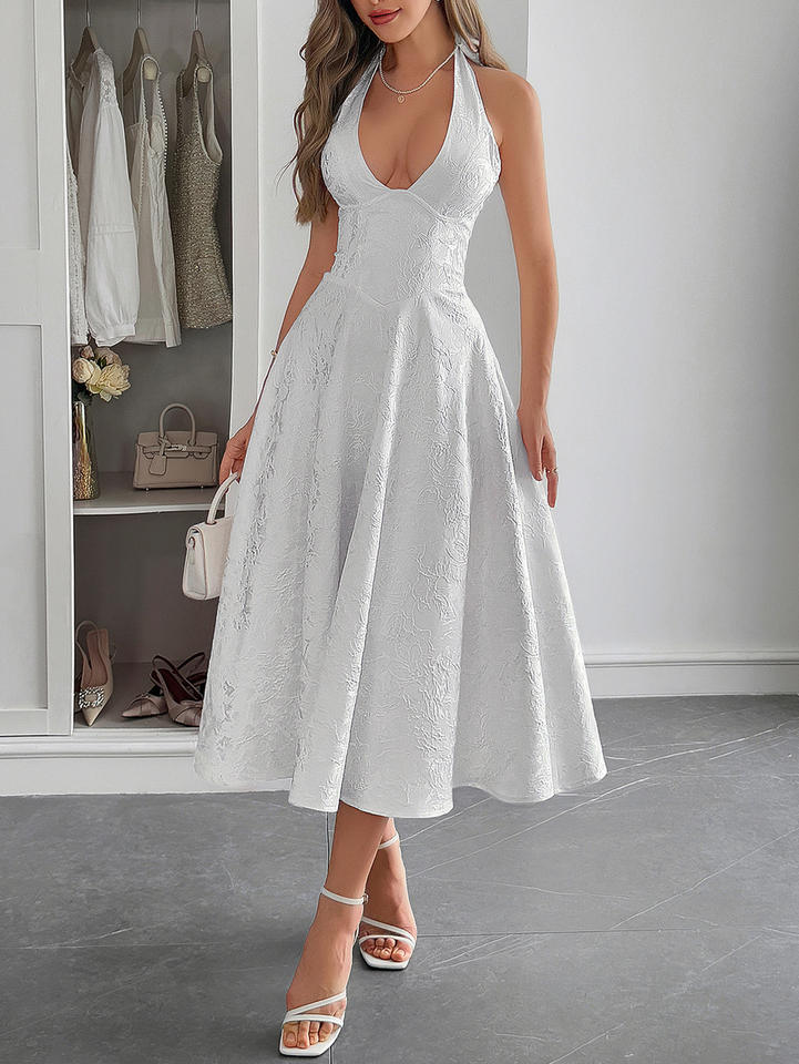 T-0732 Nuovo Arrivo Abito Lungo da Donna Sexy con Scollo a V Senza Maniche, Vestito da Festa Aderente con Pieghe a Linea A