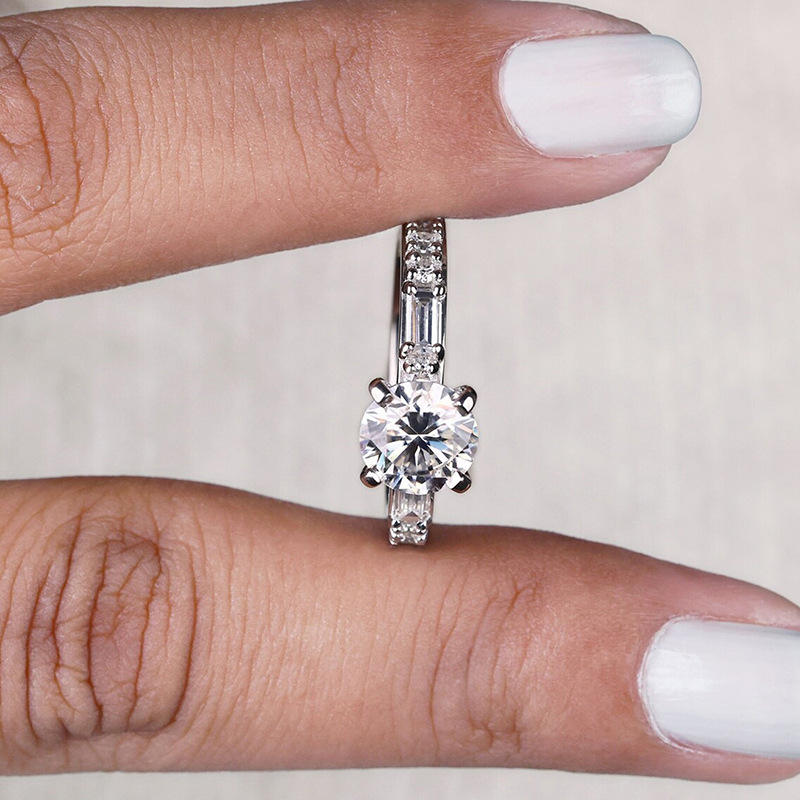 T0054 Women's White Gold Diamond Ring Round Brilliant Cut G Color Natural Diamond Engagement Ring Baguette Side Stones