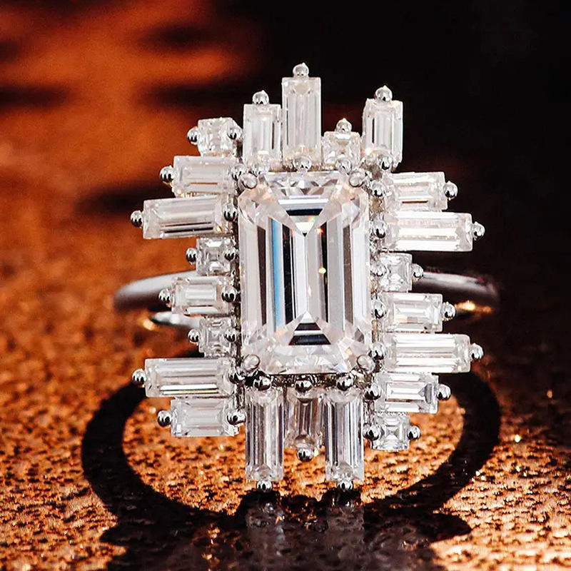 T0213 Luxury Emerald Cut Diamond Ring With Baguette Side Stones For Women Engagement Jewelry