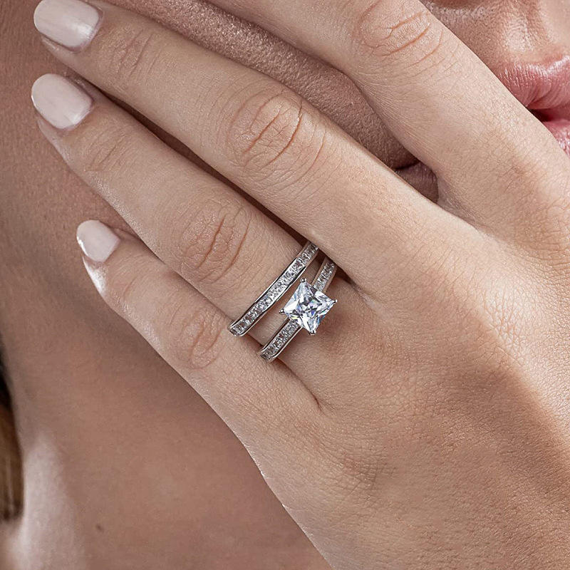 Set di Gioielli da Sposa T0216 con Diamante Taglio Principessa in Oro Bianco, Anello da Donna con Design Geometrico e Montatura a Griffe
