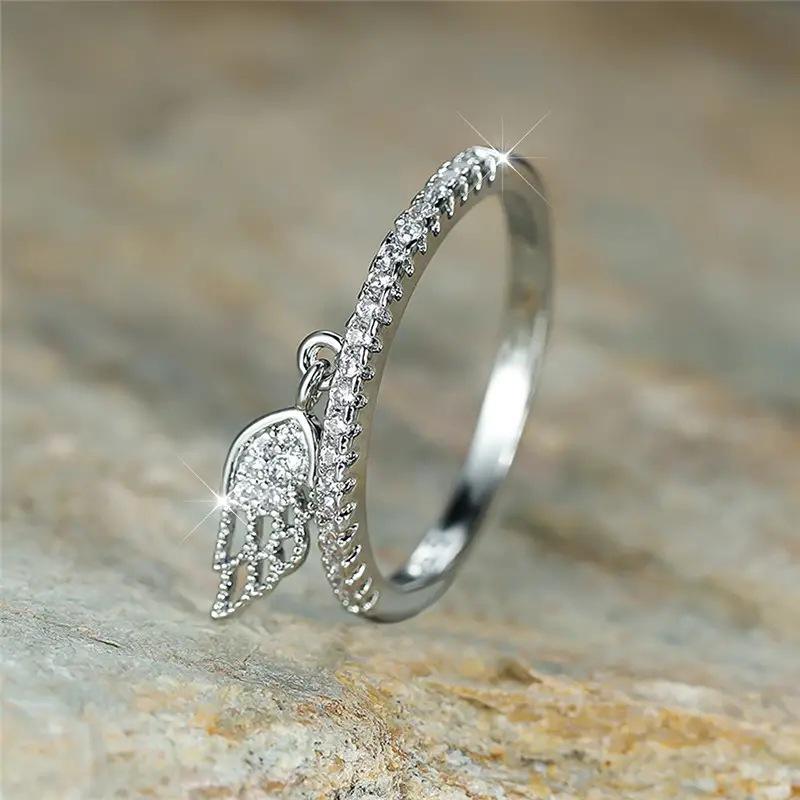 Anello in Argento T0264 con Charm Ali d'Angelo e Diamanti Naturali Taglio Brillante Rotondo, Gioiello Romantico da Donna per Uso Quotidiano