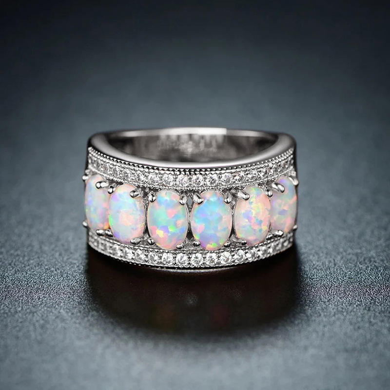 T0697 Opal Cocktail Ring Women's Natural Oval Stone Pave Setting Wedding Fashion Rings