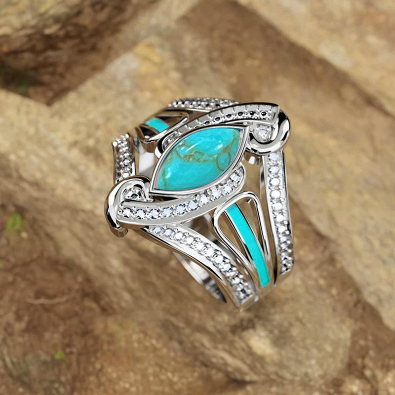 Anello da Cocktail Geometrico da Donna T0917 con Pietra Naturale Turchese Taglio Marquise e Incastonatura Pavé, Anelli di Moda per Matrimonio