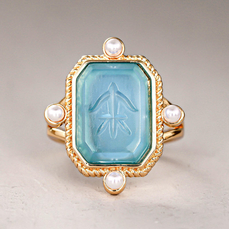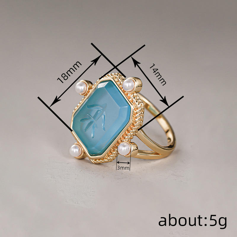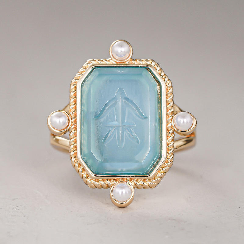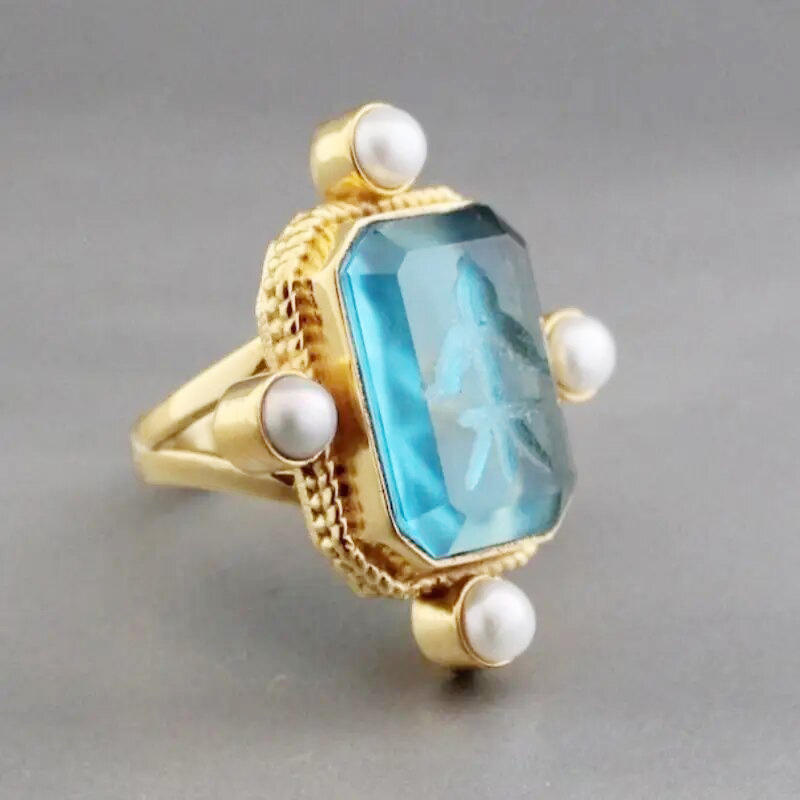 Anello Cocktail T0949 in Oro 18K con Gemma Blu e Perla Finta, Montatura Geometrica, Gioiello Unisex da Regalo