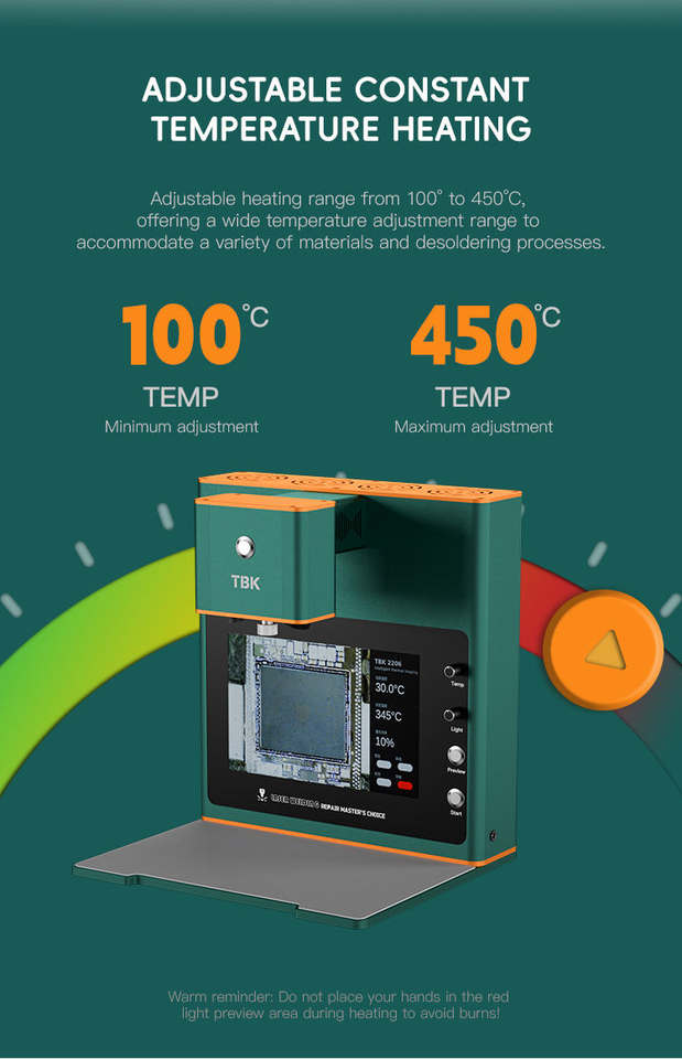 TBK2206 Saldatrice Laser di Alta Precisione 3-in-1 Temperatura Costante 50-450°C Area di Riscaldamento Regolabile 100W Doppio Voltaggio
