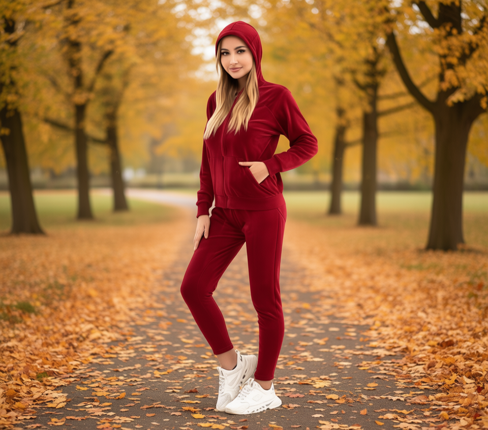 TC073-6 Women Tracksuit Full Length Hooded Zipper Fly Solid Color Casual Wear 100 Polyester Autumn Regular Fit Side Pockets