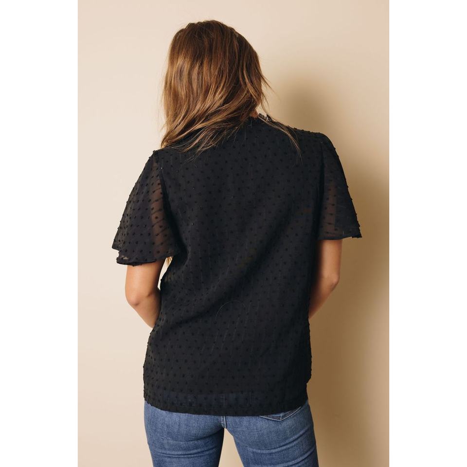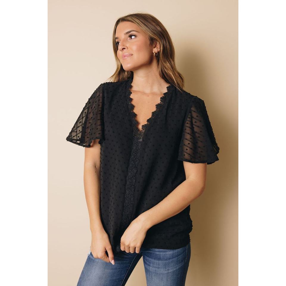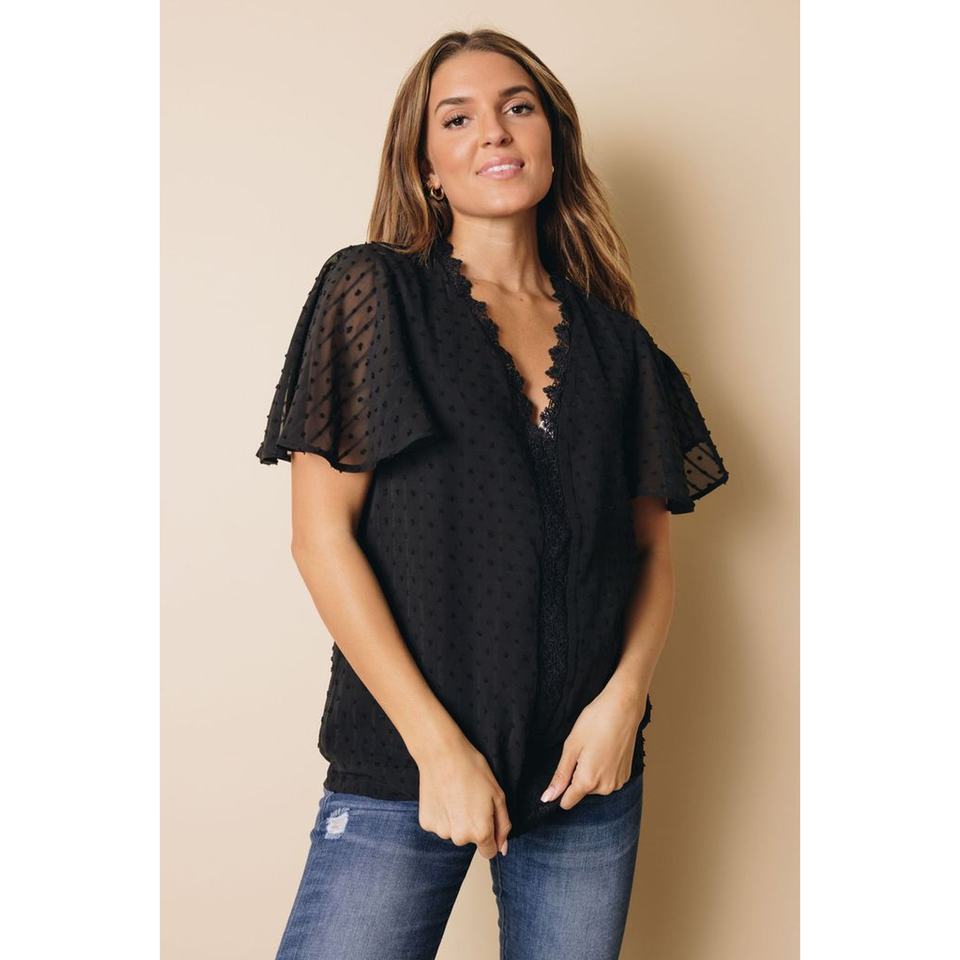 TD Women's Embroidered V-Neck Top for Swiss Dot Butterfly Sleeve Ruffled Collar Logo Loose Fit Silk Knit Sizes XL for Autumn