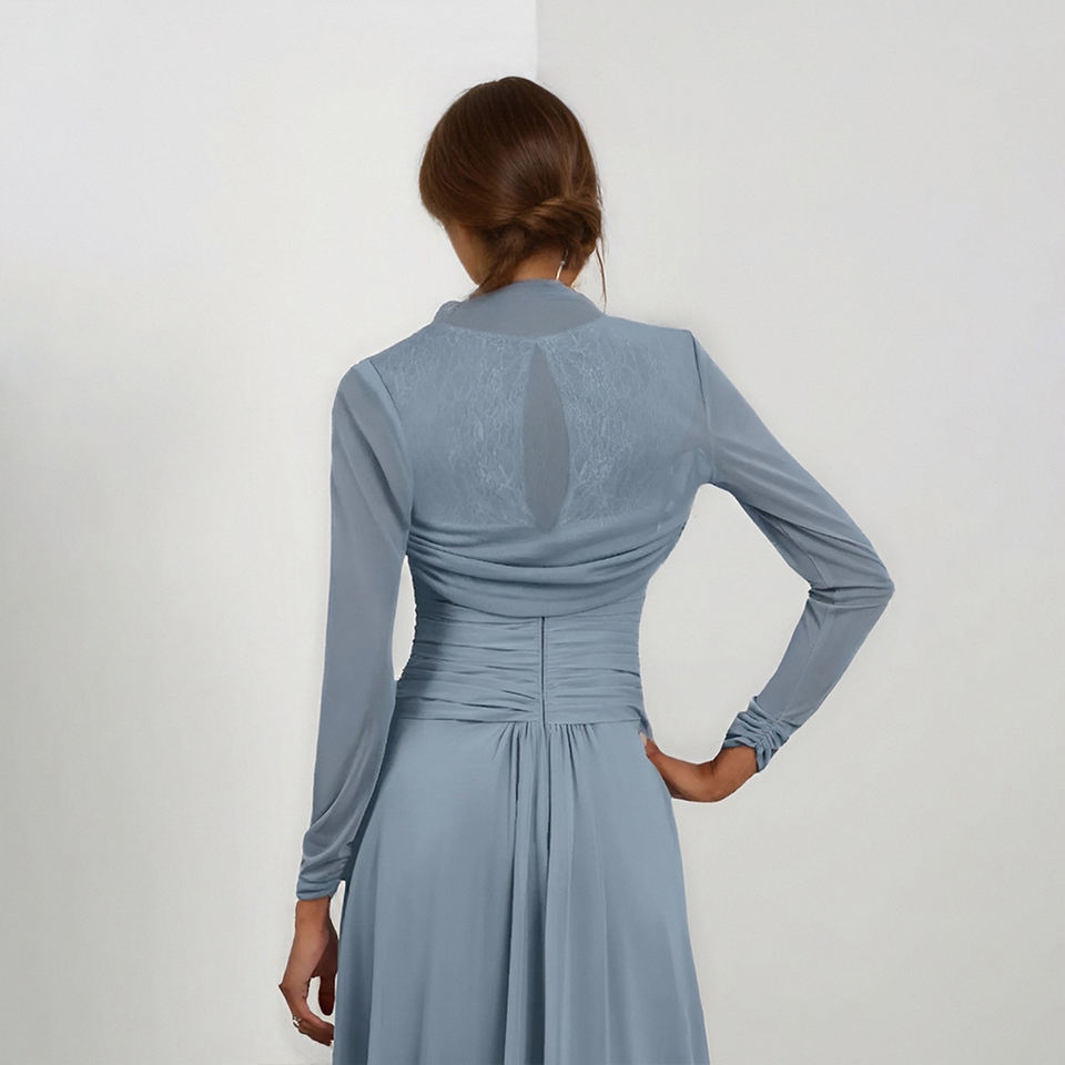 TEENYEE Designer Modern Wedding Bridal Wrap Mesh Pleated Neckline Evening Cape Long Sleeve Bridal Bolero Jacket
