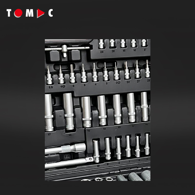set di strumenti, Cricchetto, Presa, Bocchetta per candela, Giunto universale, Adattatore con impugnatura a T per estensione, Prese per bit, Chiavi a brugola, PezziStrumento Include
