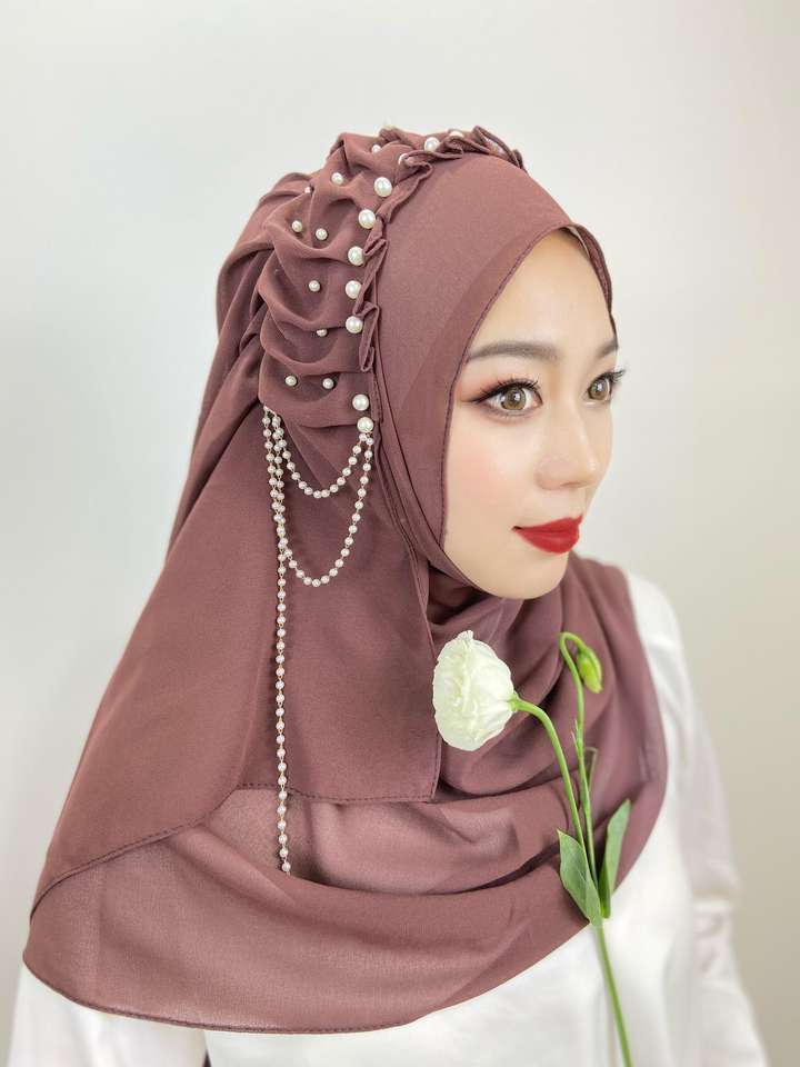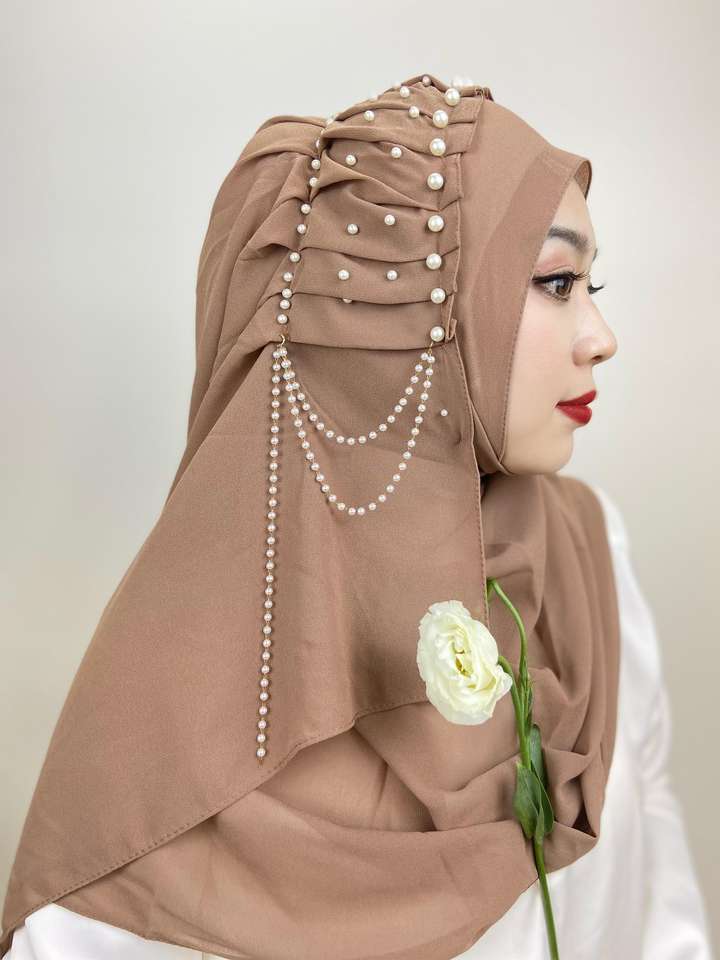 TOMO Women Mohammed Shawl Solid Bandana Color with Pleated Outfit Chiffon Pearl Beading Nude Malaysia Hijab Women Scarves