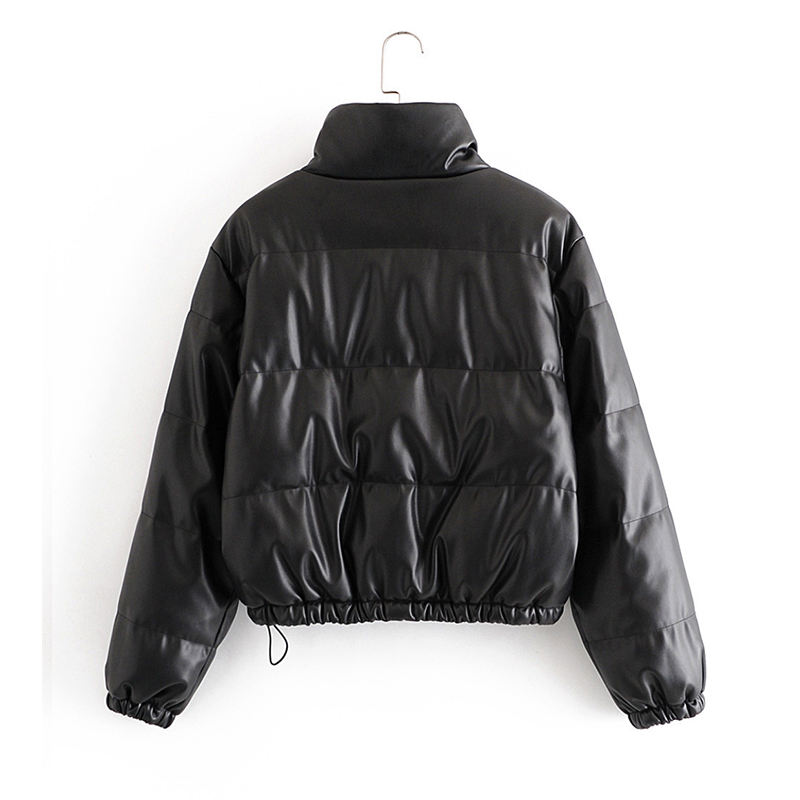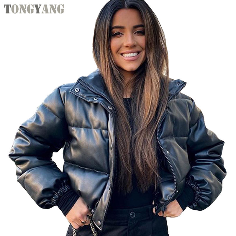 TONGYANG Winter Thick Warm Short Parkas Women Fashion Black PU Leather Coats Ladies Elegant Zipper Cotton Jackets