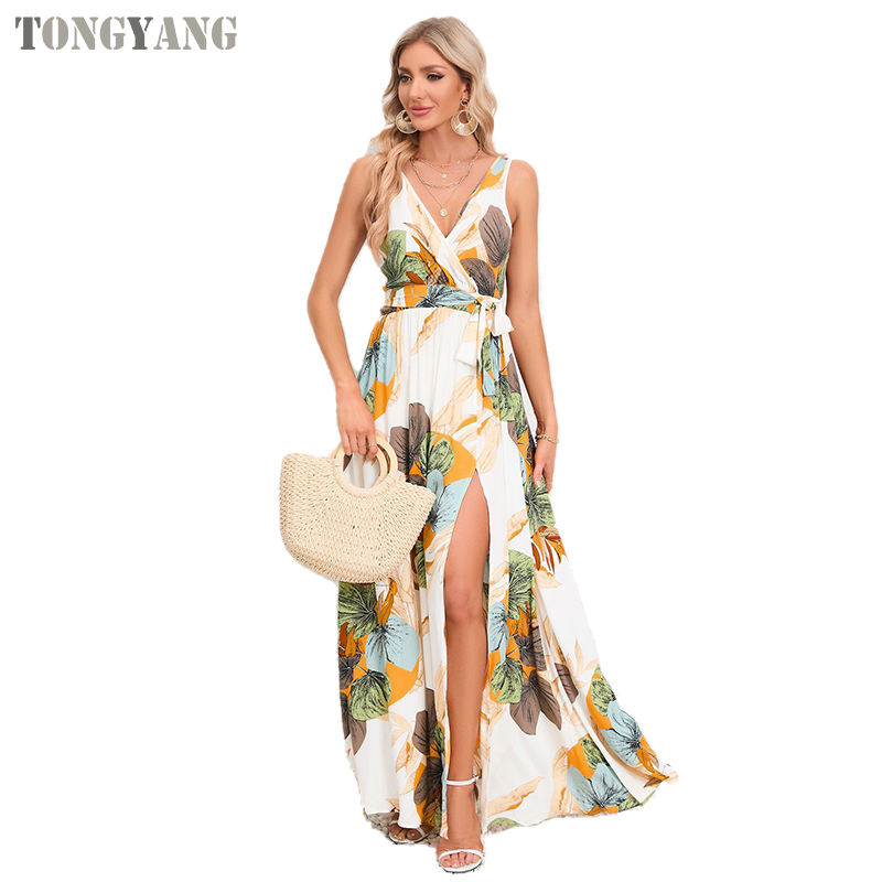 TONGYANG Women Bohemia V-neck Sleeveless Print Ethnic Beach Boho Long Dress Retro Hippie Boho Dress