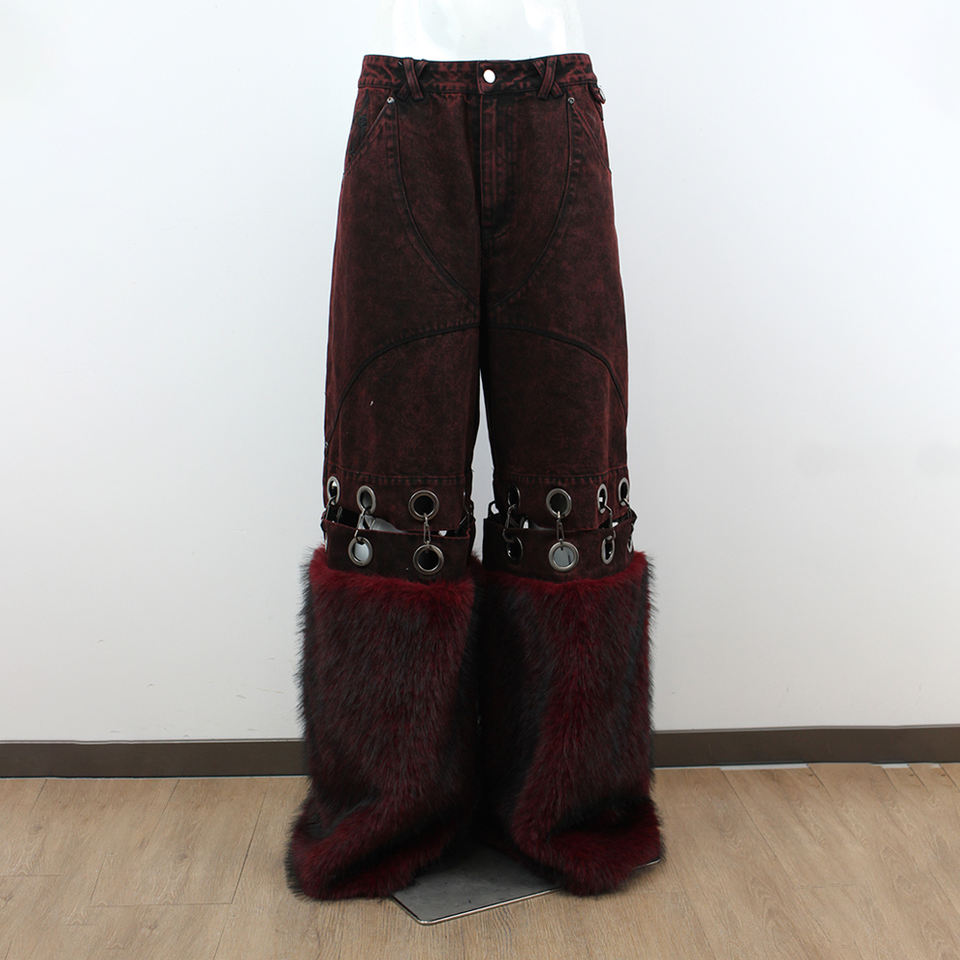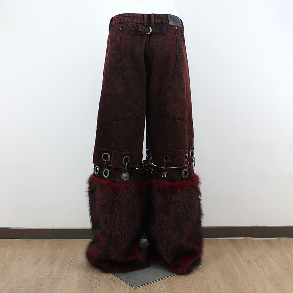 Top show DENIM pantaloni in Denim rosso scuro in DENIM eco-pelliccia polsini in metallo anelli Hardware unico Punk Gothic Street Fashion Jeans