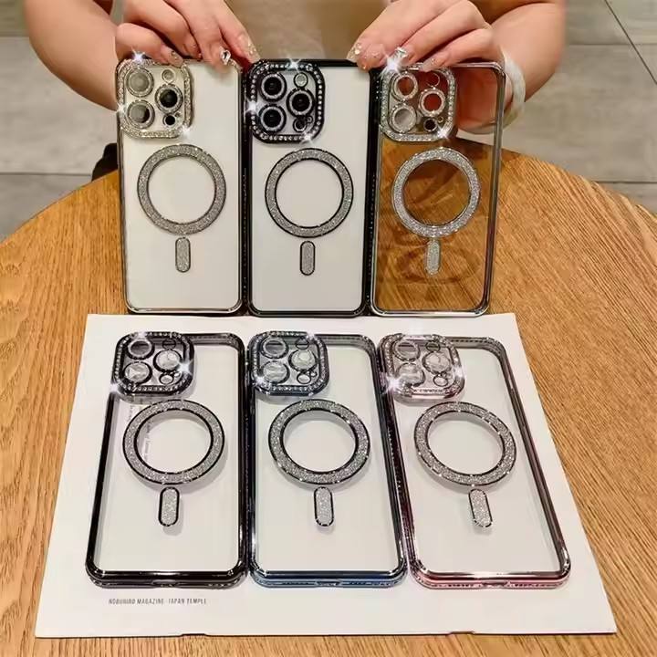 TPU morbida Cover magnetica posteriore per iPhone 11 a 17 tutti i modelli di protezione per fotocamera con Glitter a diamante