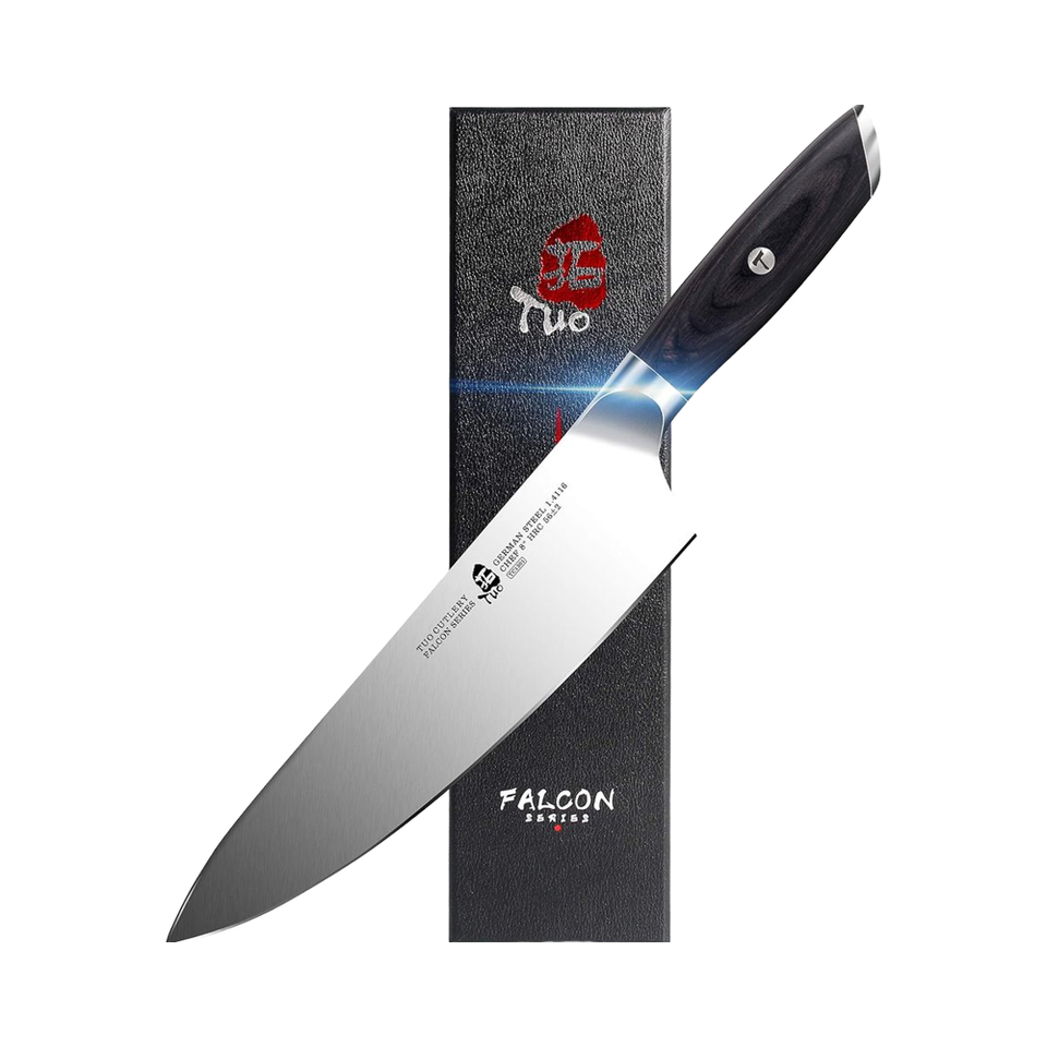 Coltello da Chef Giapponese Serie TUO Falcon Gyuto 8 Pollici con Acciaio Tedesco HC e Manico in Pakkawood, Confezione Regalo Inclusa