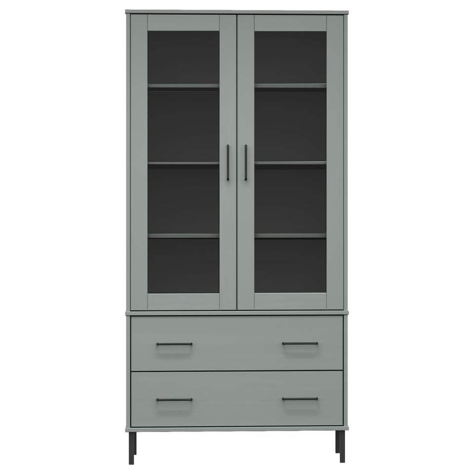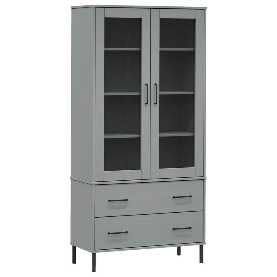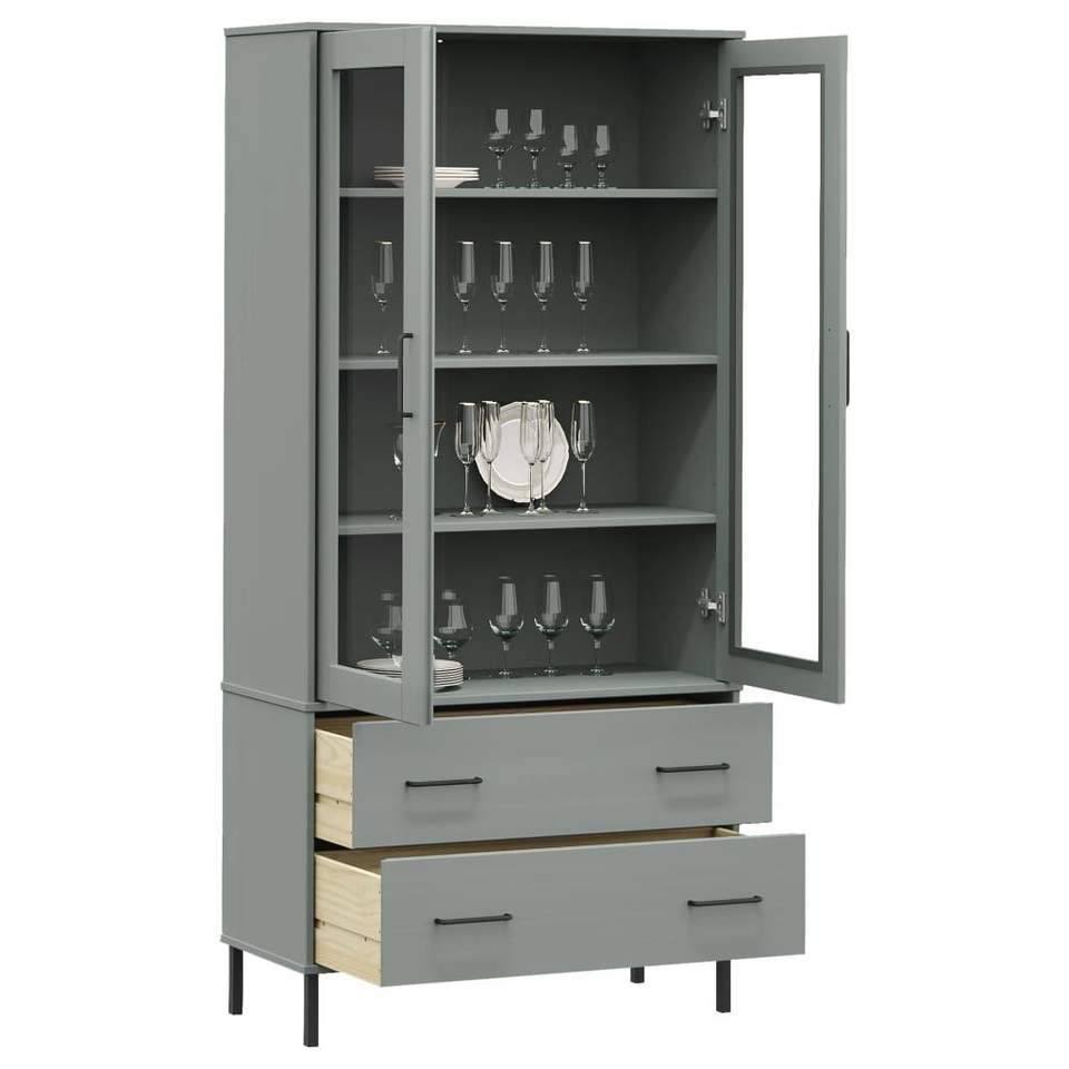 Libreria in Legno di Pino Grigio con Vetro e Struttura in Metallo, Mobile Moderno per Soggiorno, Scaffale Etagere con 4 Ripiani Autoportante