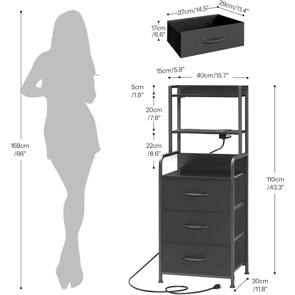 Comodino Alto con Stazione di Ricarica LED, 3 Cassetti in Tessuto e Ripiani Aperti, USB-A, Type-C e 2 Prese AC