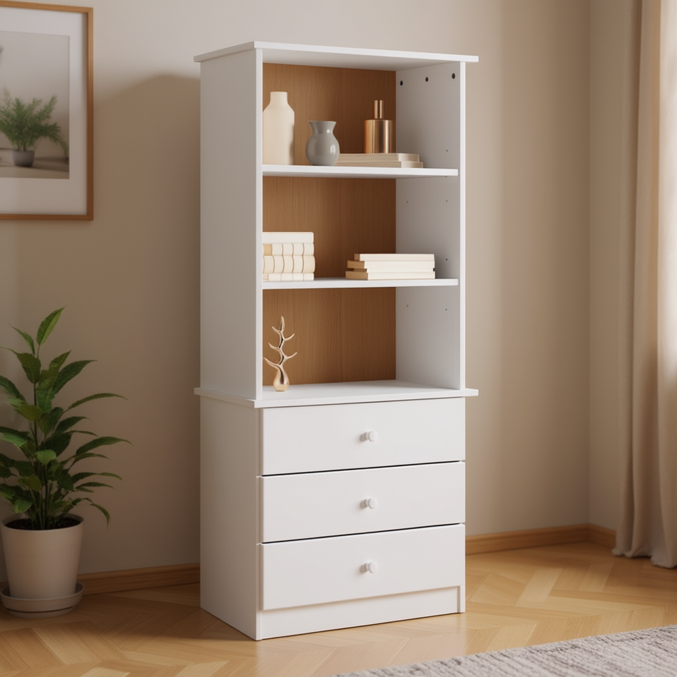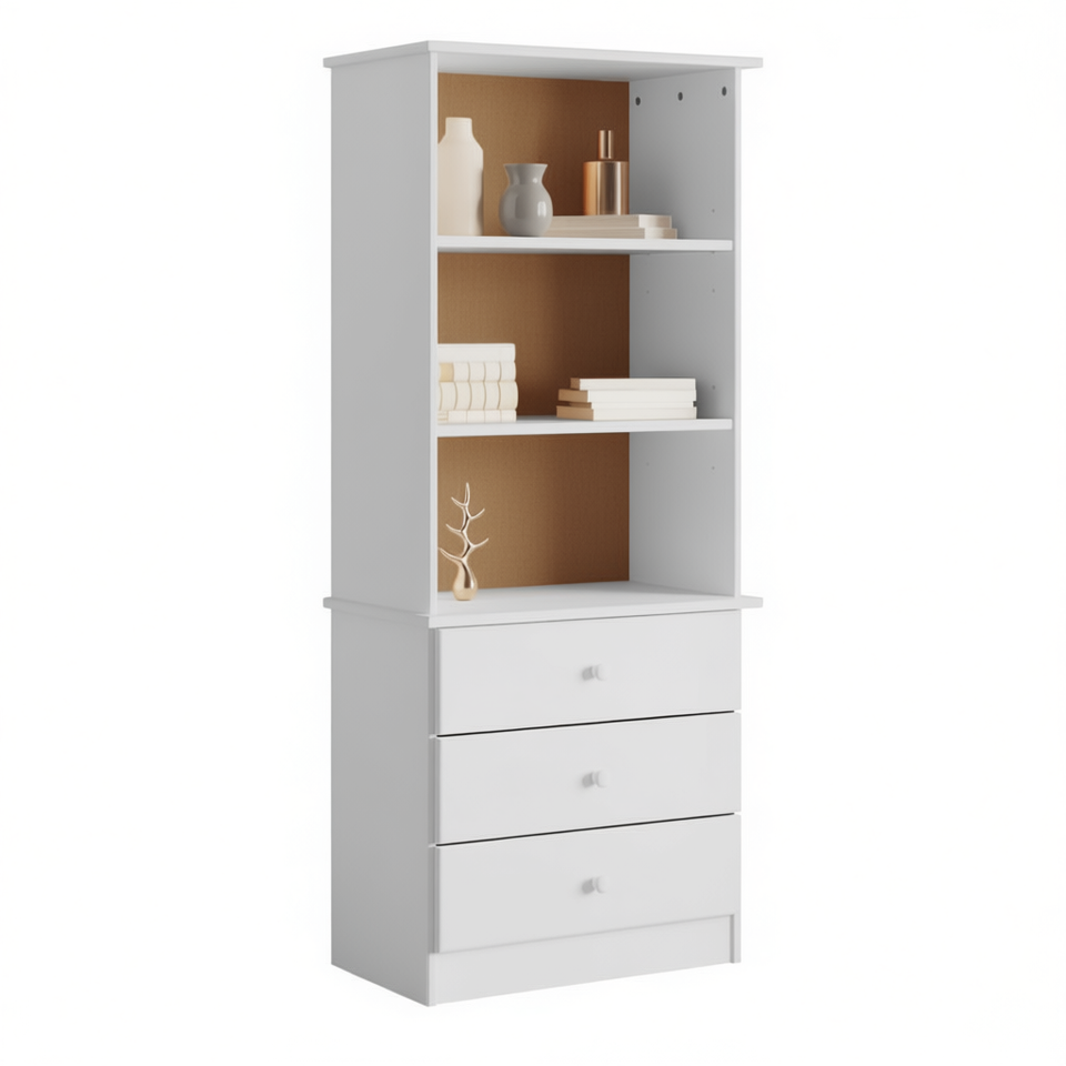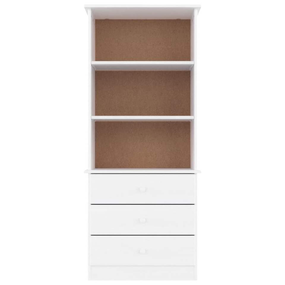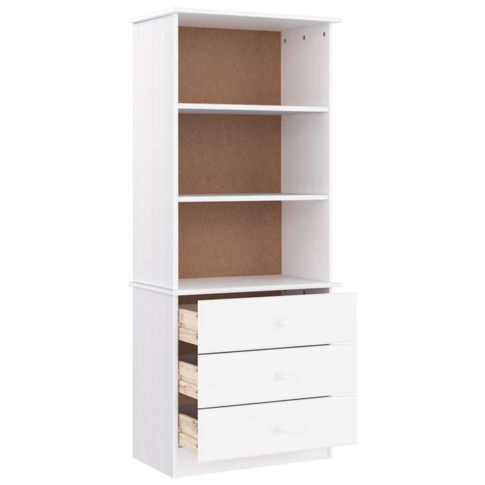 Libreria Alta Bianca con 3 Ripiani e 3 Cassetti, Design Moderno, Arredamento per Soggiorno, Struttura in Legno di Pino, Autoportante