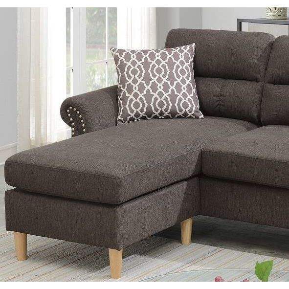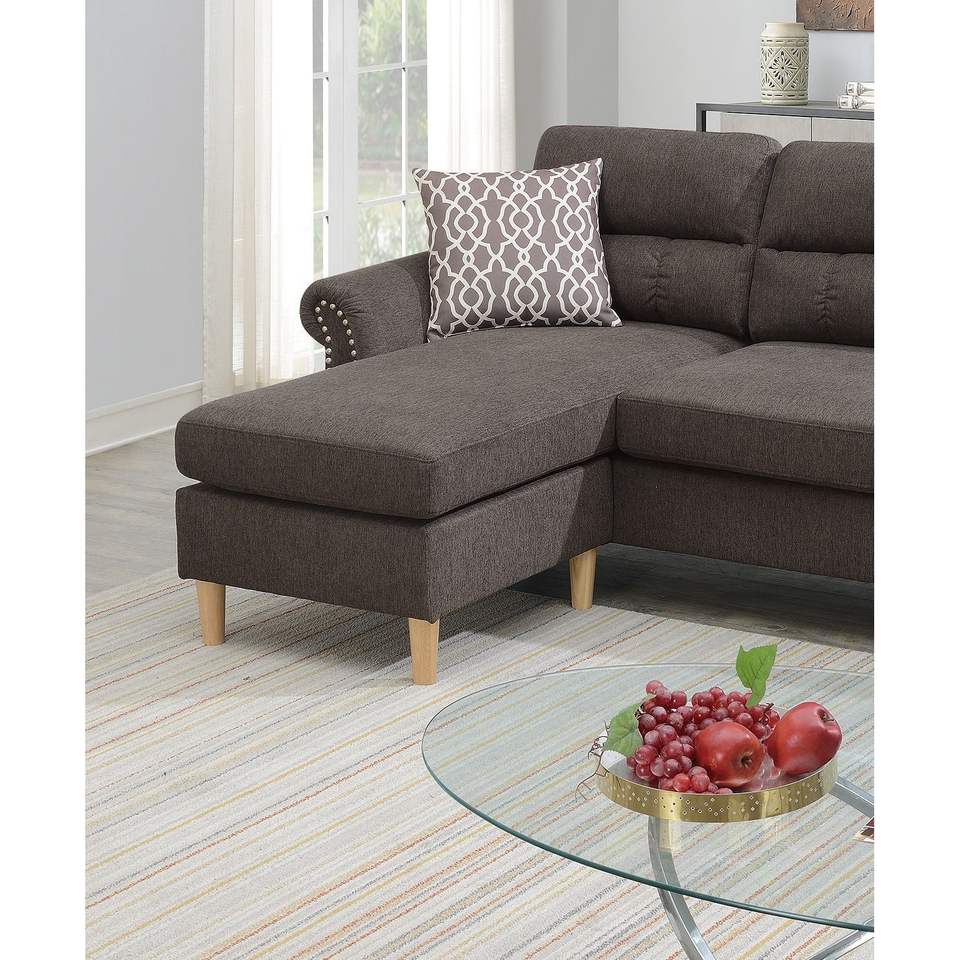 Divano Sezionale Reversibile in Polifibra Color Tan con Chaise Longue, Cuscini Morbidi e Borchie Decorative per Soggiorno