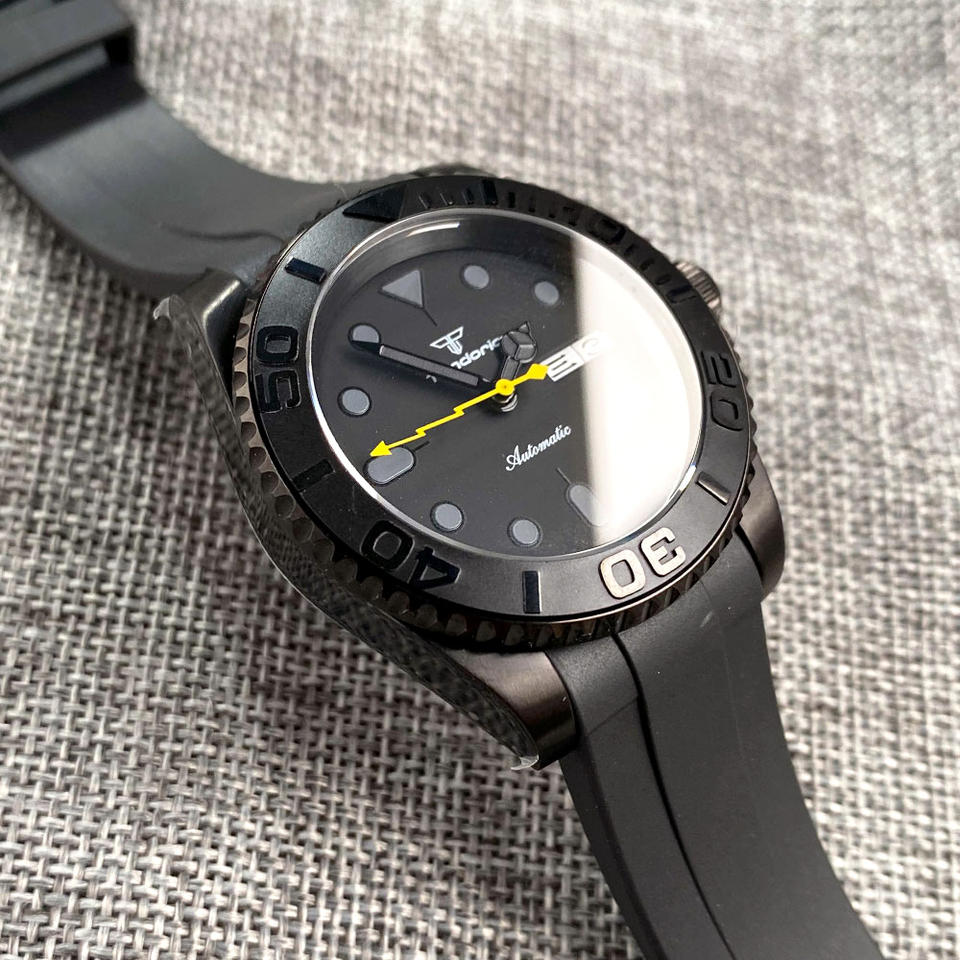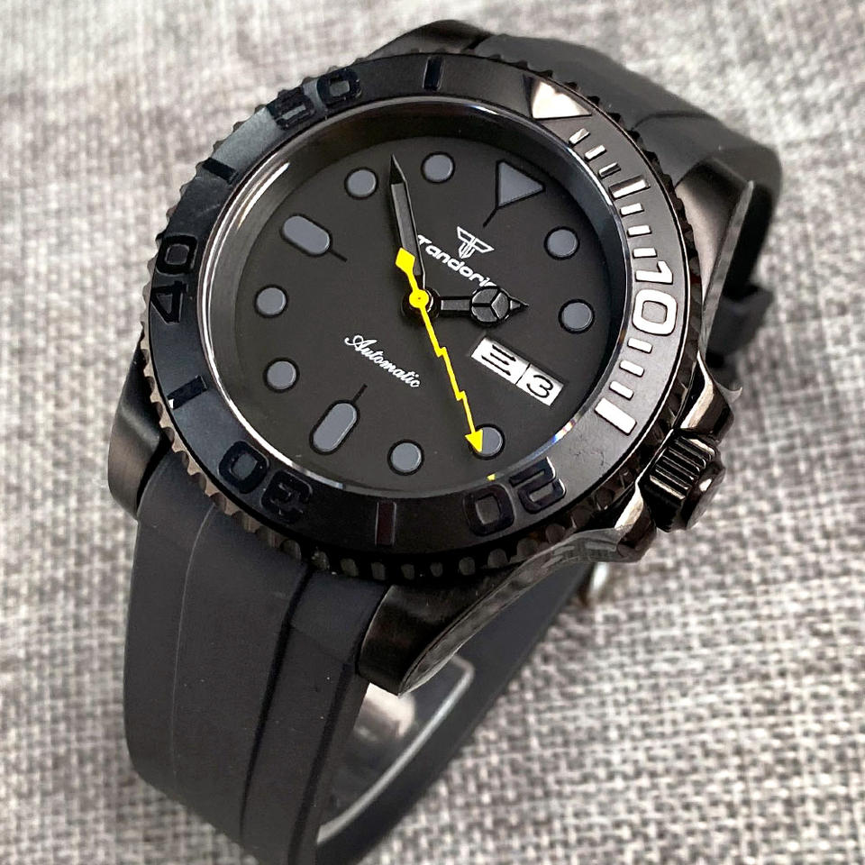 Tandorio 200m Waterproof Diver Black Mechanical Watch Men Yellow Flash Hand NH36 Movement SUB Sport Clock Weekday Rubber Band