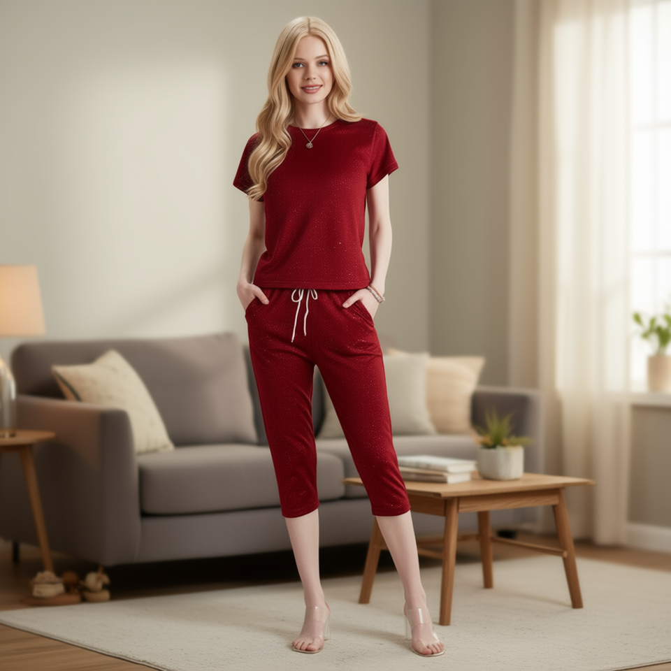 Tc386 Women Tracksuit Set Short Sleeve Crew Neck Glitter Print Solid Color Loose Fit Calf-Length Pants With Side Pockets