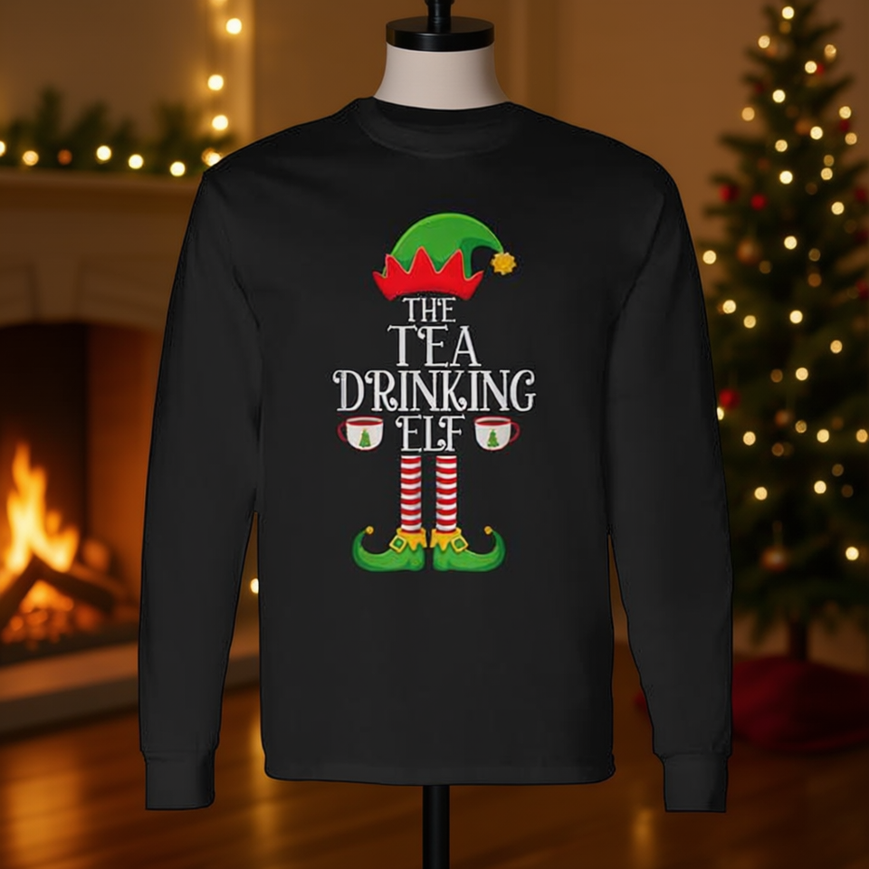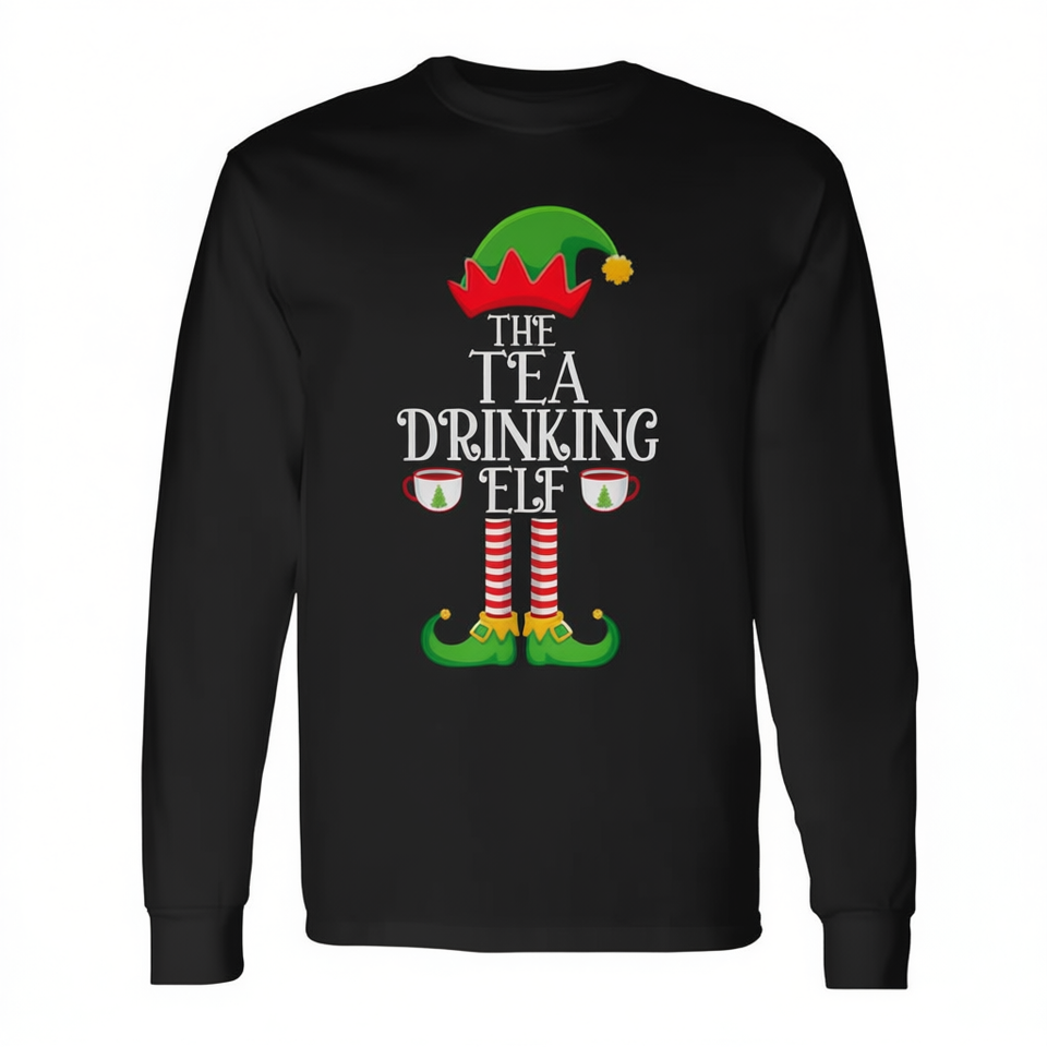 T-shirt unisex a maniche lunghe con scollo rotondo, motivo Tea Drinking Elf, abbinabile per la famiglia, per le vacanze di Natale