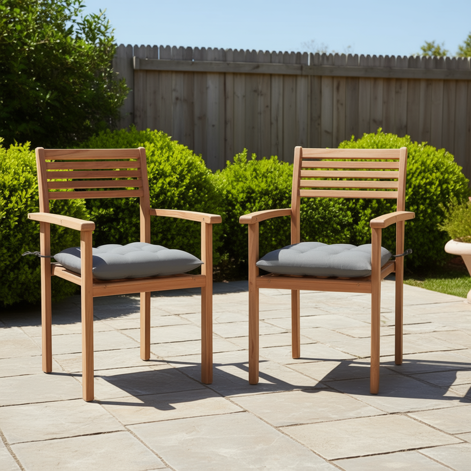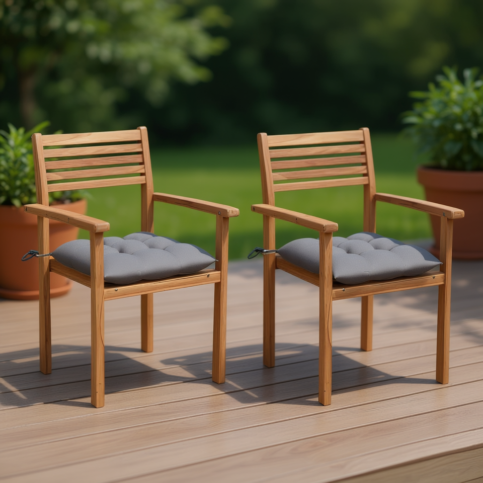 Set di 2 sedie da giardino in teak con cuscini grigi, mobili da esterno in legno dal design contemporaneo per patio o giardino