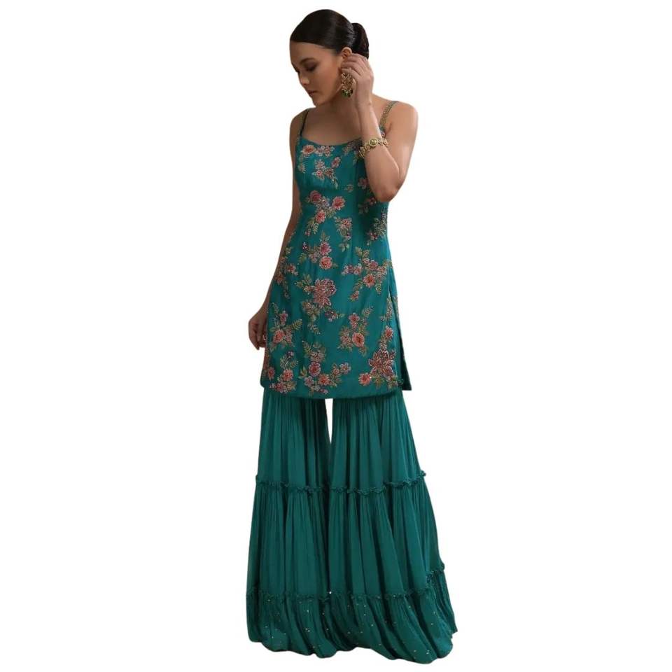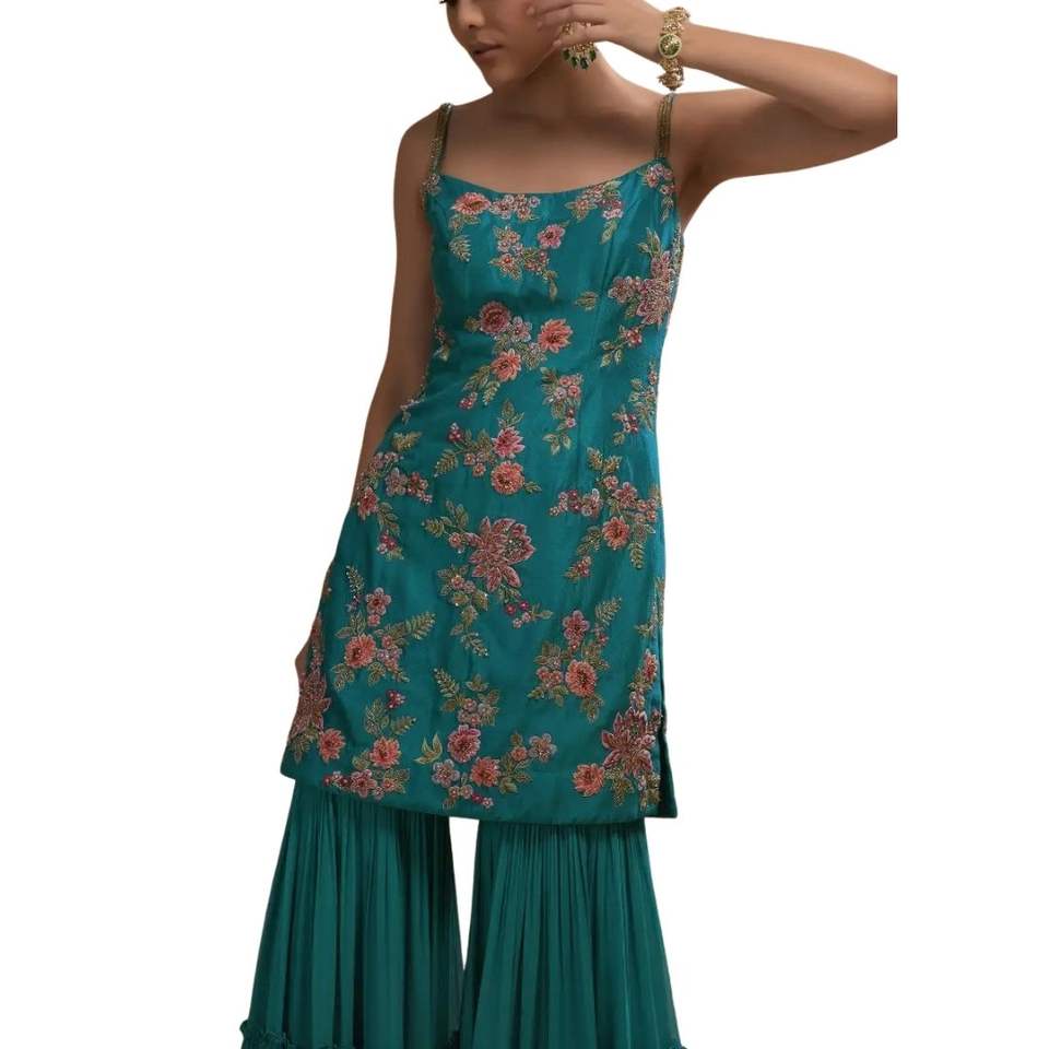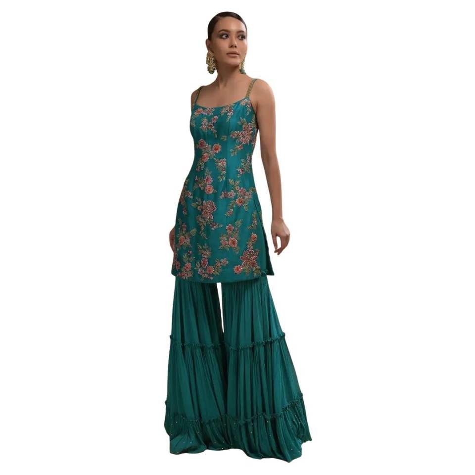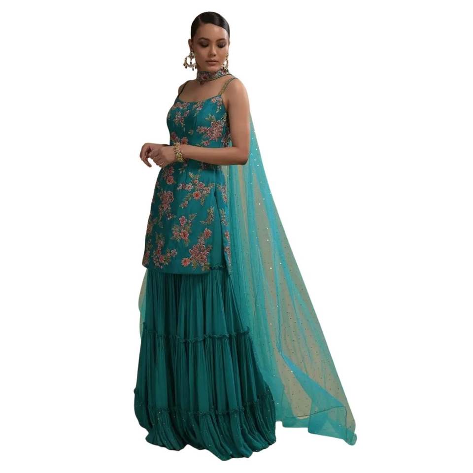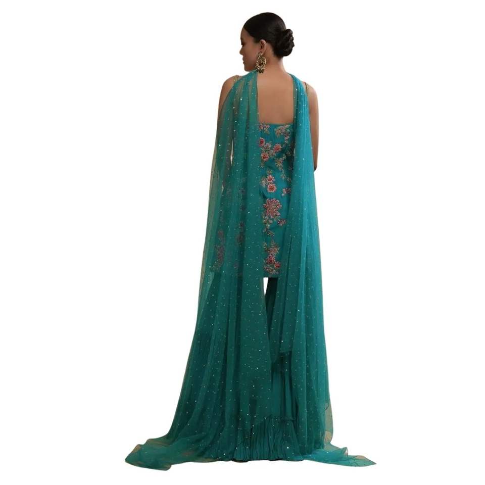 Teal Resham Embroidered Kurta Sharara Set with Dupatta for Festive Indian Wedding Party Reception Occasion Wear