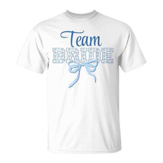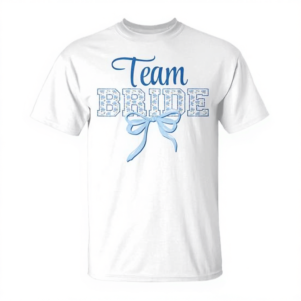 T-shirt coordinata floreale Team Bride Coquette blu con fiocco per eventi promozionali e feste nuziali