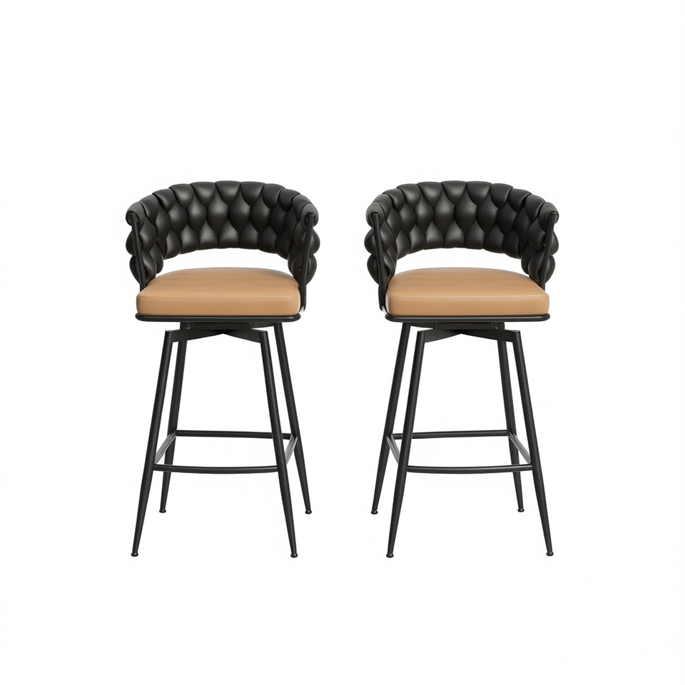 Set di 2 Sgabelli da Bar in Pelle Intrecciata, Girevoli a 360°, Seduta Color Tan, Gambe Nere, Design Contemporaneo, Arredamento per Bar
