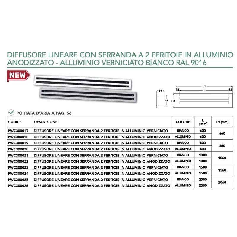 Diffusore Lineare Tecnosystemi con Serranda a 2 Fessure in Alluminio Anodizzato per Sistemi HVAC Domestici Modello PWC300024 Lunghezza 1500mm