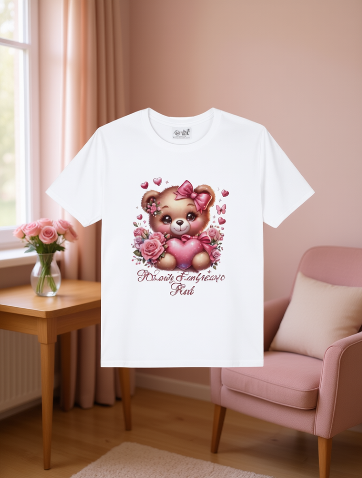 Teddy Bear Pattern Women's T-Shirt Short Sleeve Polyester Cute Heart Flower Design Round Neck Regular Fit All Seasons