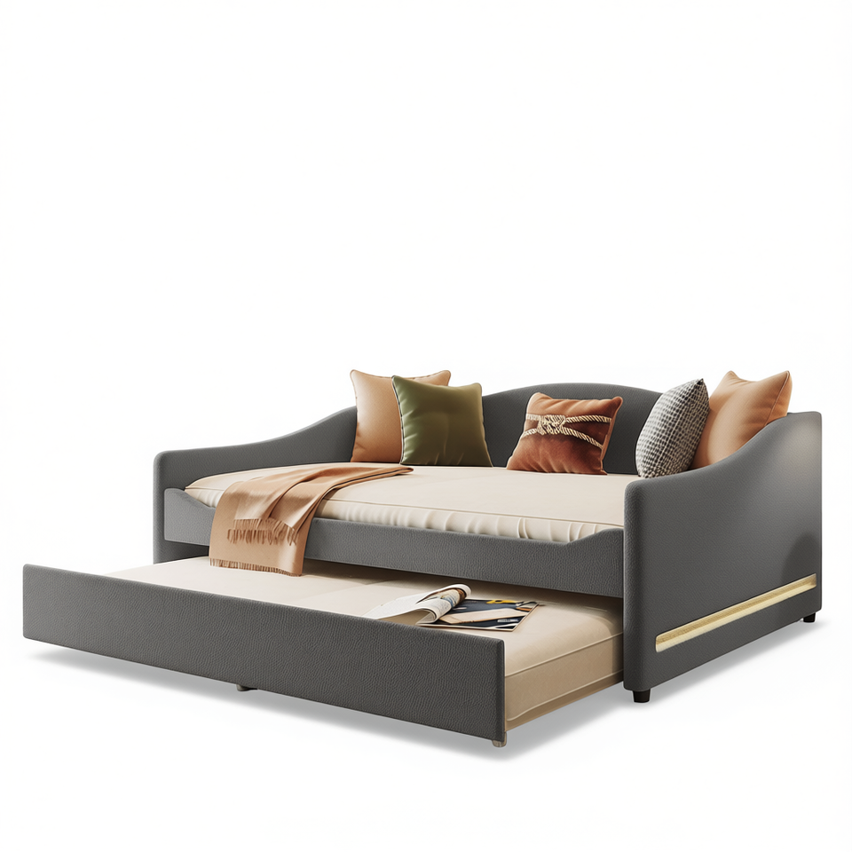 Divano letto imbottito a grandezza naturale con letto estraibile in pile grigio chiaro, design moderno e morbido