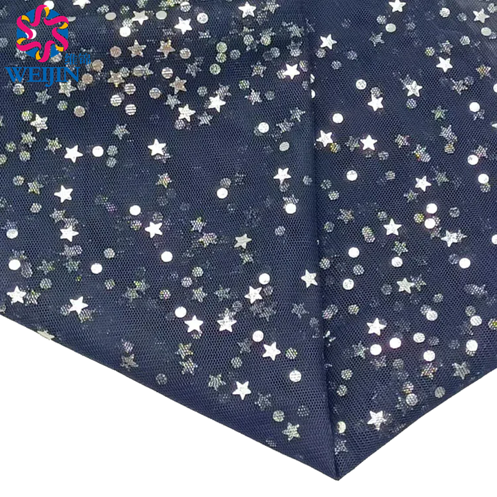100% di tintura tessile in poliestere con motivo a forma di stella in lamina lucida Tulle Power Mesh tessuto in maglia da palcoscenico abbigliamento per feste decorazione di abiti da festa