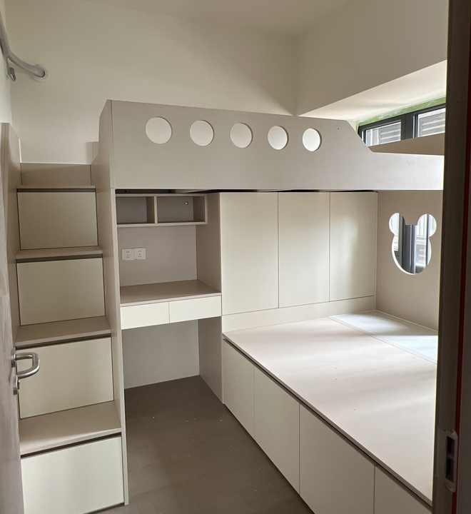 La cameretta è progettata con letti a castello personalizzati in mente, con spazio per armadi per sfruttare al meglio il posto.