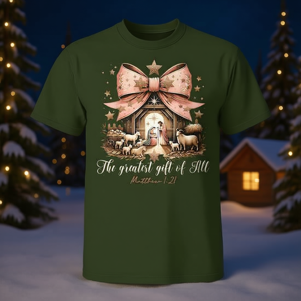 T-shirt con stampa digitale del Presepe natalizio e fiocco, girocollo a maniche corte, il regalo più grande di Natale, perfetta per le feste