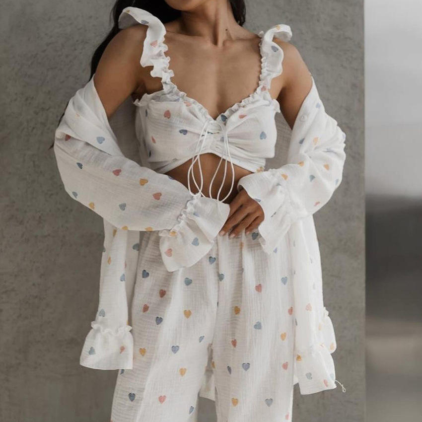 The New Design of Women Home Wear Three-piece Set to Support Custom Leisure Everything Loose Love Printed Women Pajamas