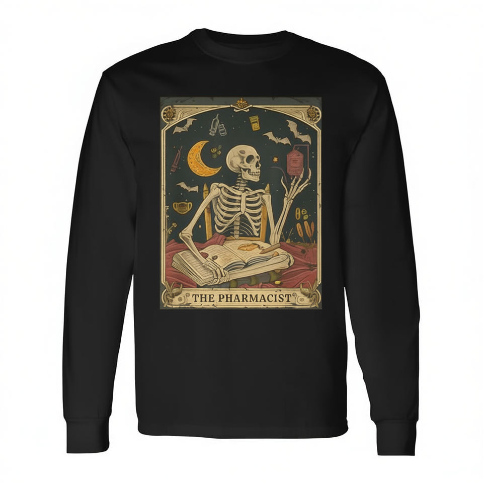 T-shirt a maniche lunghe con stampa The Pharmacist Skeleton Tarot Card, design per studenti di medicina e tecnici farmaceutici