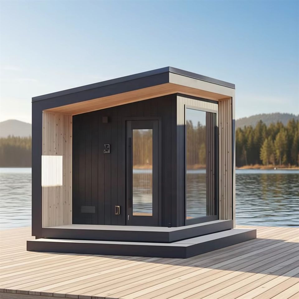 La moderna sauna in legno Serene In Alps presenta un design ecologico con una vista panoramica sulle foreste.