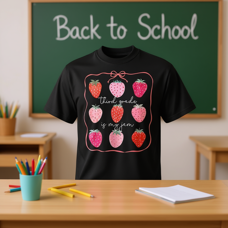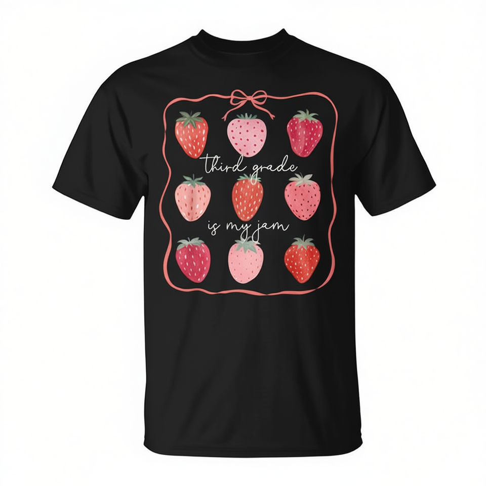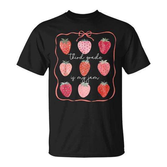 T-shirt per il ritorno a scuola della terza elementare con stampa "Third Grade Is My Jam Strawberry" per bambini della terza elementare