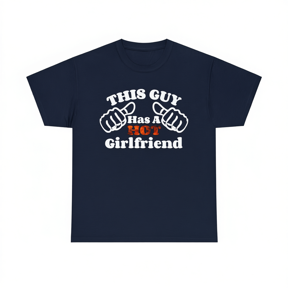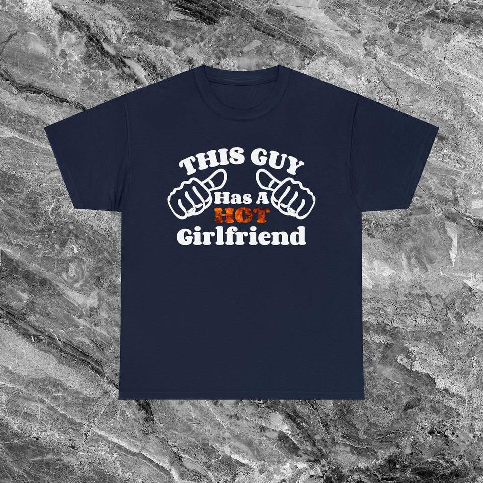 Maglietta con stampa 'This Guy Has A Hot Girlfriend', regalo divertente per anniversario, per fidanzato, San Valentino