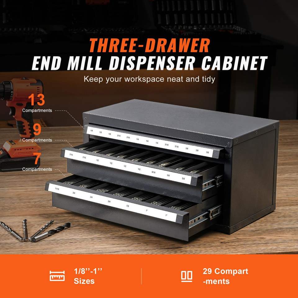 Armadietto Portautensili in Acciaio a Tre Cassetti per Organizzazione Frese, Contiene 29 Scomparti da 1/8'' a 1'' con Etichette Impilabili