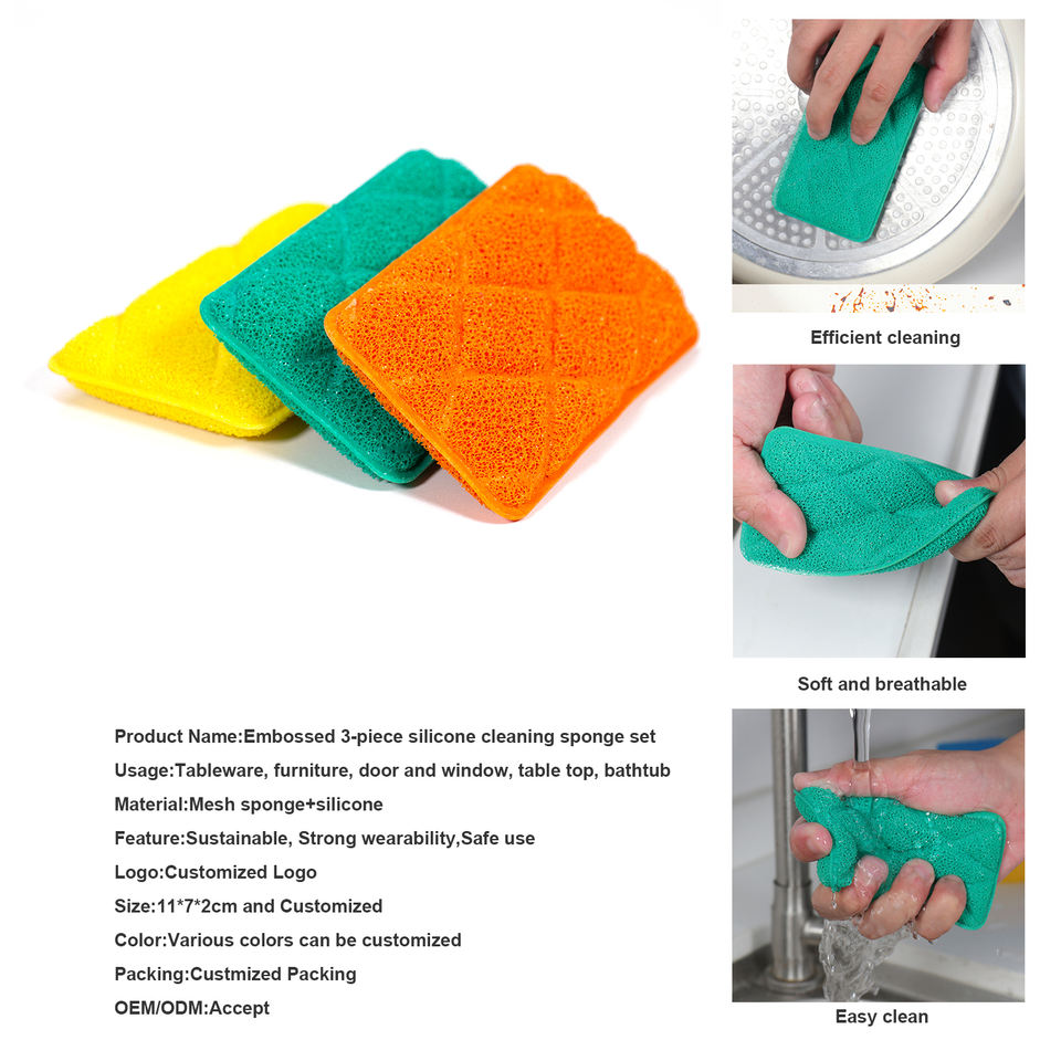 Tre Spugne in Silicone Goffrate per la Pulizia della Cucina