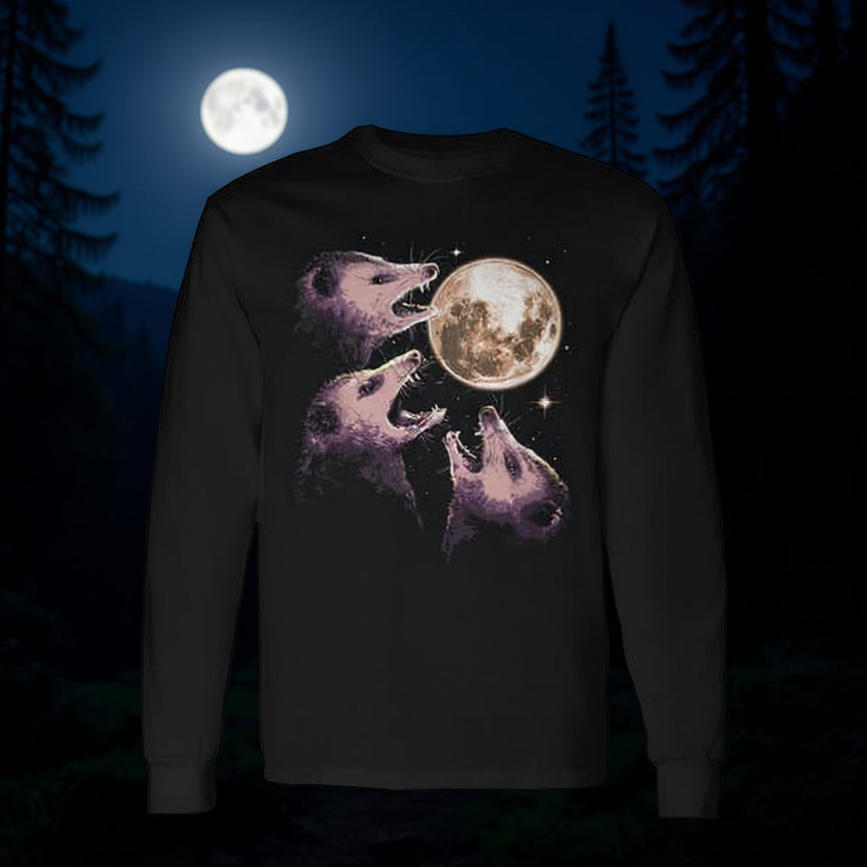 T-shirt a maniche lunghe con tre opossum che urlano verso la luna, design grafico nero