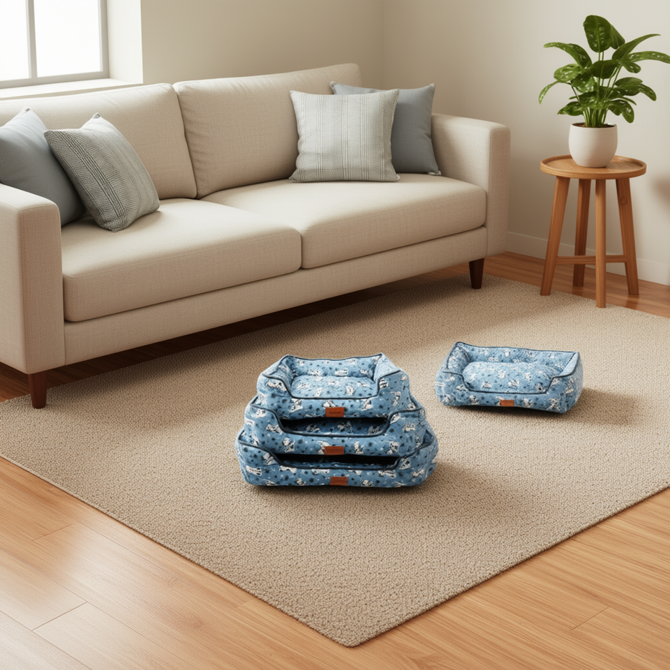 Three-Piece Printed Linen Dog House Set with Blue Background for Pet Beds