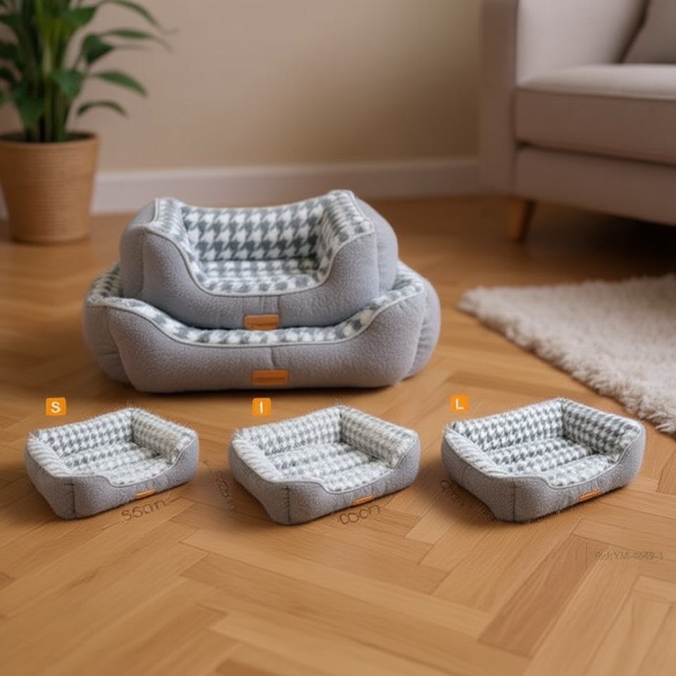 Three-Piece Set of Grey Pet Beds Featuring Sand Release and Thousand Bird Grid Design with a Rabbit Hair Square Nest