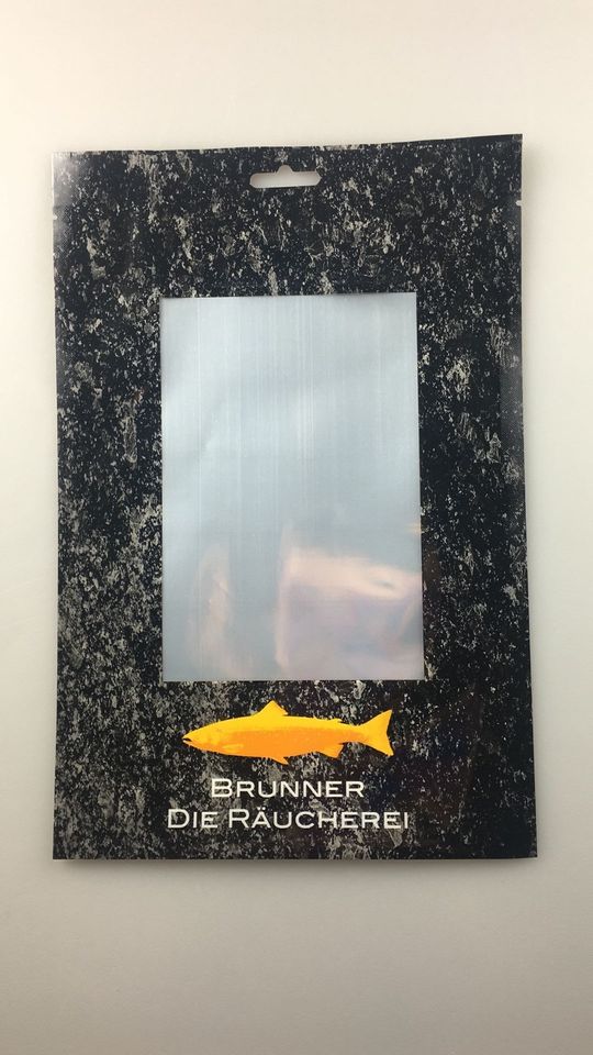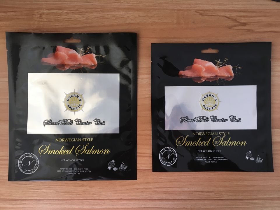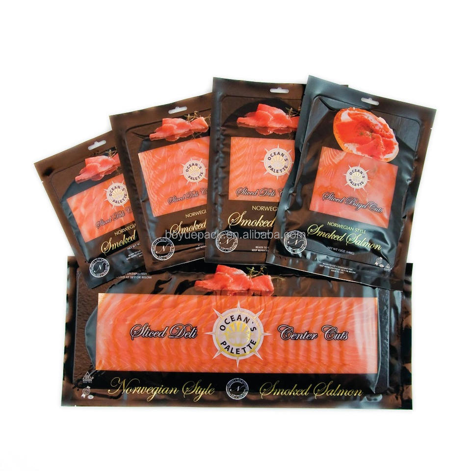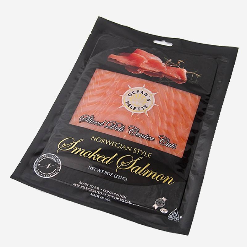 Custodia sigillante sottovuoto a tre lati con tacca a strappo e confezione di salmone affumicato per finestra trasparente