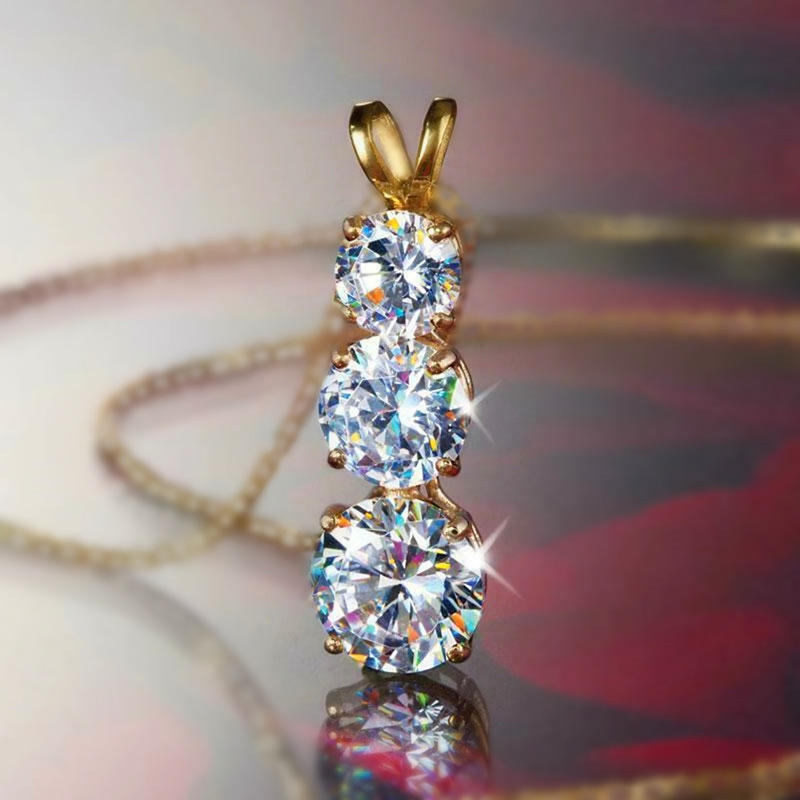 Ciondolo Tre Pietre Placcato Oro con Cristalli Strass Taglio Brillante Rotondo, Montatura a Griffe, Gioiello Classico da Donna per Fidanzamento