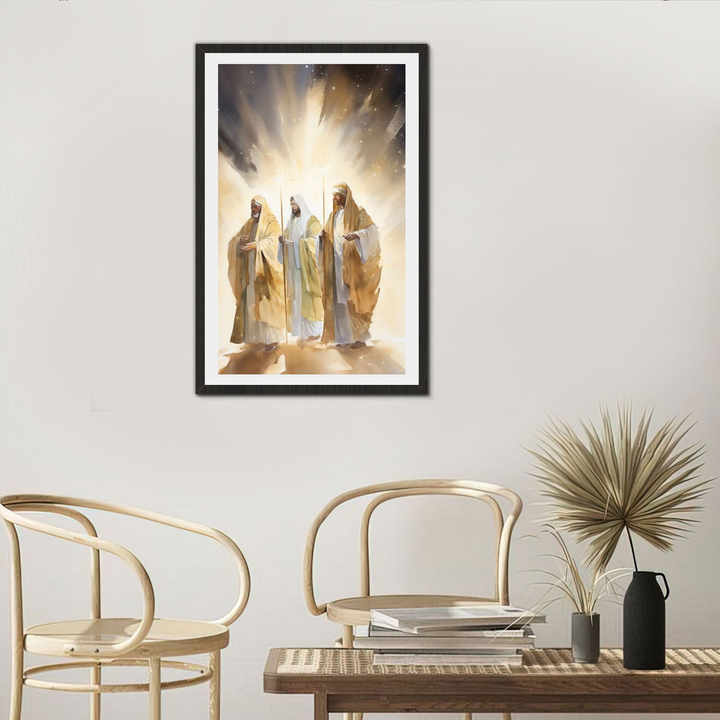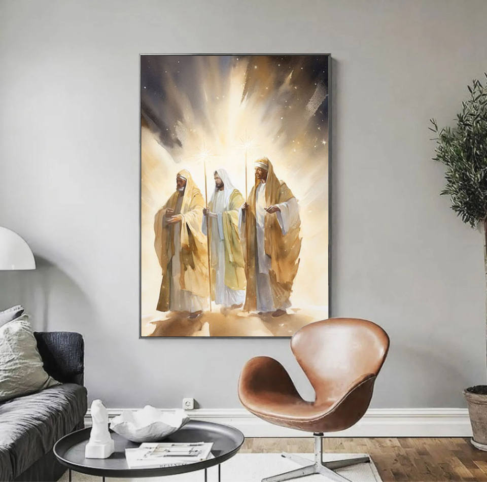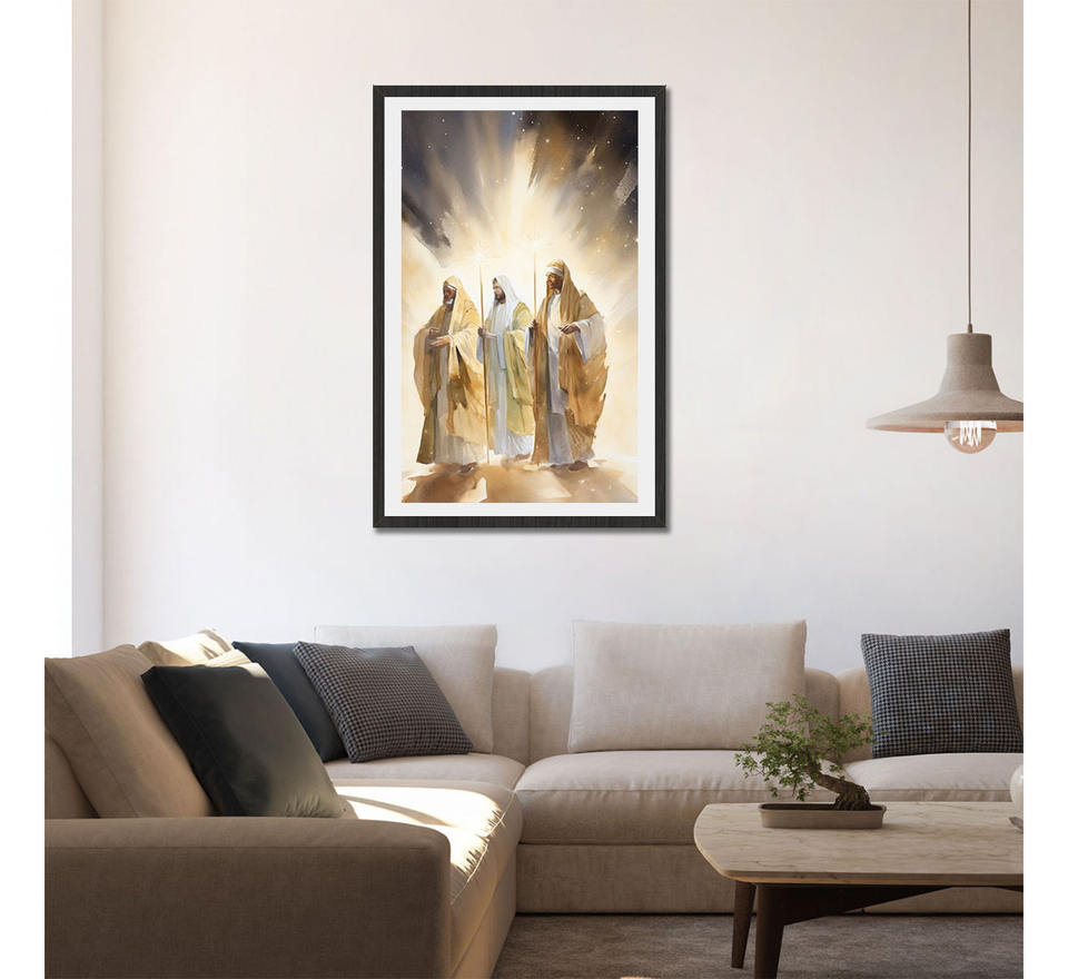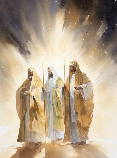 Tre saggi in cerca, prostranti davanti al bambino divino