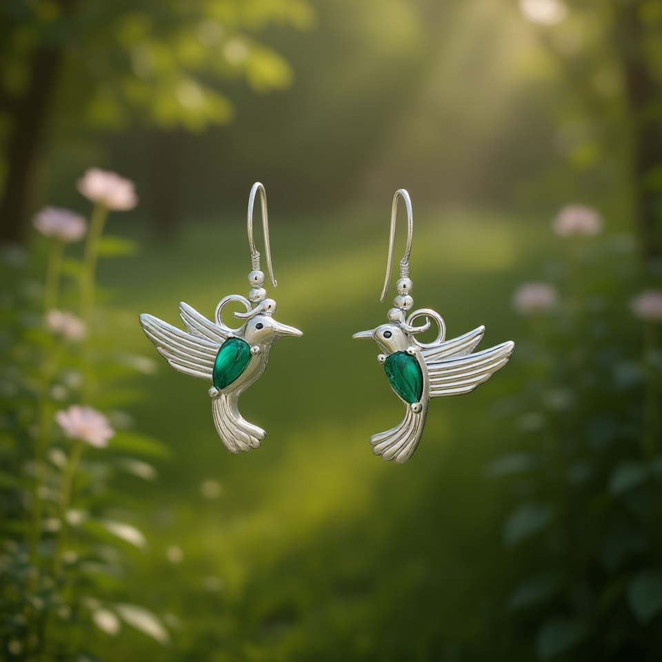 Orecchini Pendenti in Argento Tibetano con Colibrì e Smeraldo Taglio a Pera, Montatura a Castone, Gioielli da Donna Stile Romantico